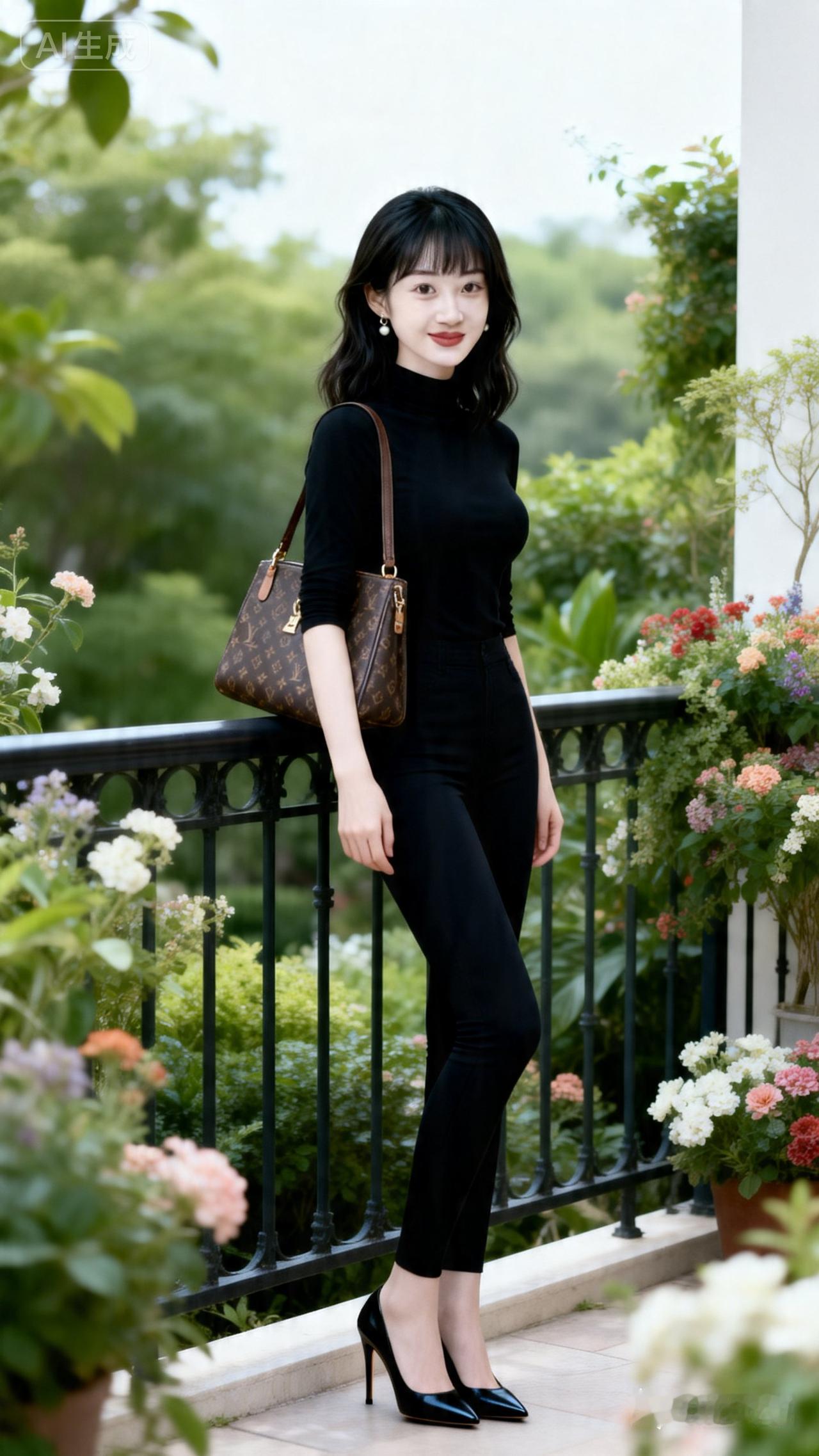 优雅黑丝绒穿搭,手提包点缀,花丛中的时尚少女