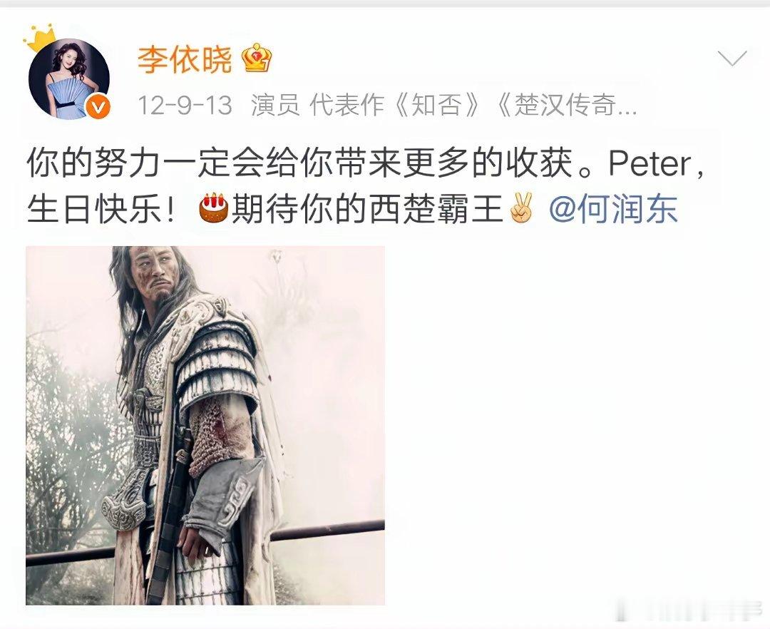 李依晓连续八年为何润东庆生。跟何润东合拍过的女演员,包括高圆圆,万人迷陈好,还有邓超的老婆孙俪,贾静雯,黄奕,对他的评价都挺好的。最近何润东凭借着“项羽”一角,14年后,再次翻红。他身穿铠甲,骑着马,在战场厮杀的飒爽英姿,被网友评论,就像一幅水墨画。其实,何润东几乎把历史上英俊又威猛的英雄角色,全都饰演过。比如项羽。比如,吕布。饰演“貂蝉”的陈好,曾在接受采访时说,何润东穿着古装,第一次出现在她面前时,她觉得这个人就是吕布。何润东和李依晓在《楚汉传奇》中,分别饰演,项羽和虞姬。网上有一段视频,虞姬最后为项王舞剑,自刎在他面前。何润东眼神里的震撼,难过,心痛,全程没有一句台词,只是默默两行泪。这部剧是在2011年8月份开机拍摄,2012年12月份上映。李依晓,从这一年开始,连续八年不间断地为何润东庆生,而且,每一次,都称呼他为“霸王”。可见,李依晓对这个合作过的霸王,还是很有好感的。也许是因为剧中的意难平,也许是出于对朋友的关心,大家觉得呢?