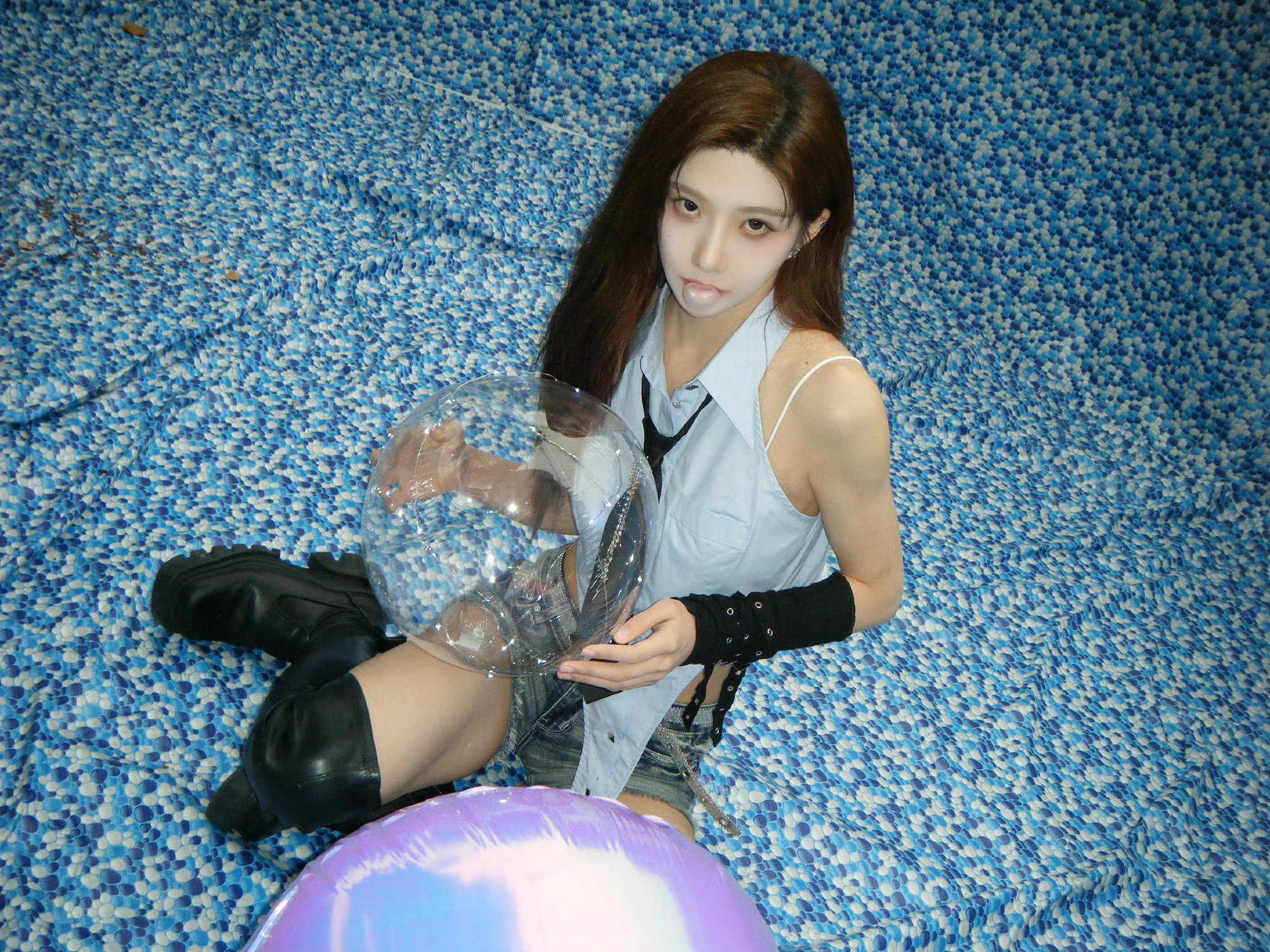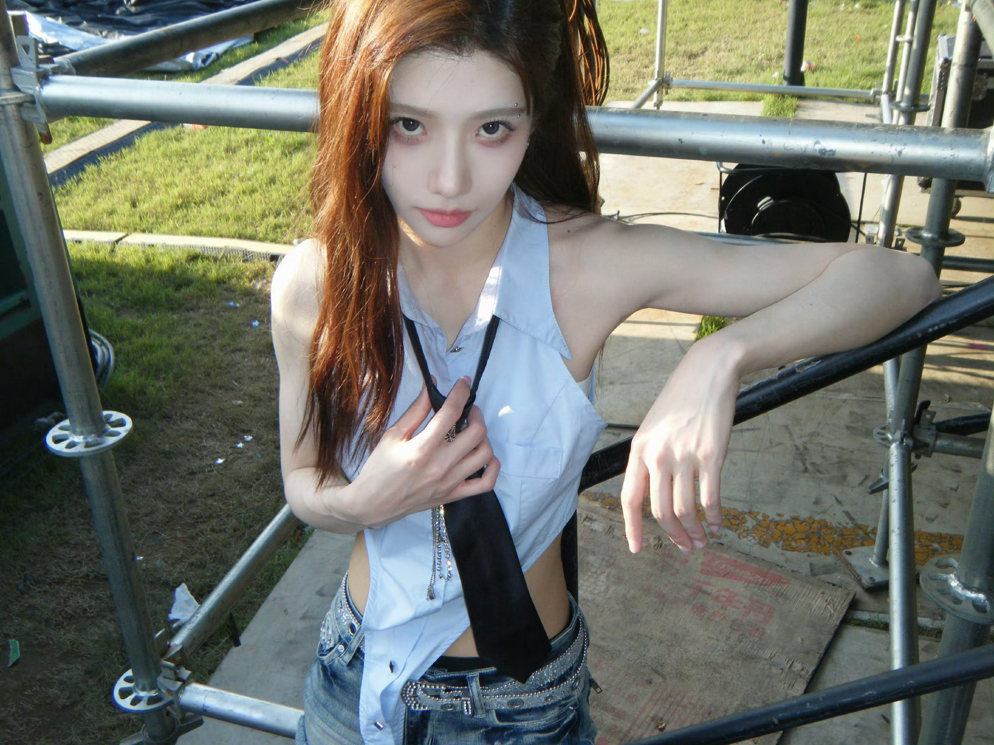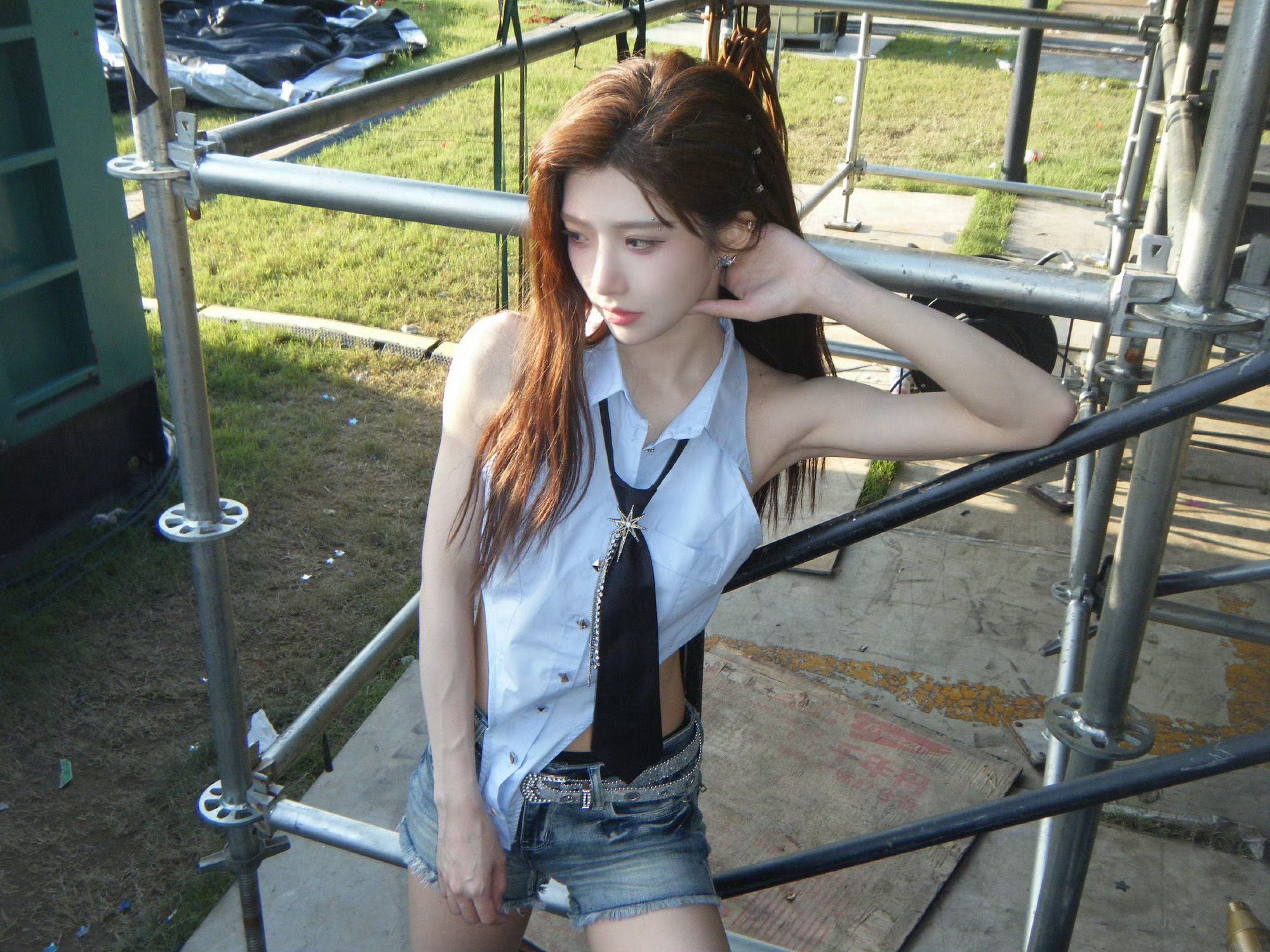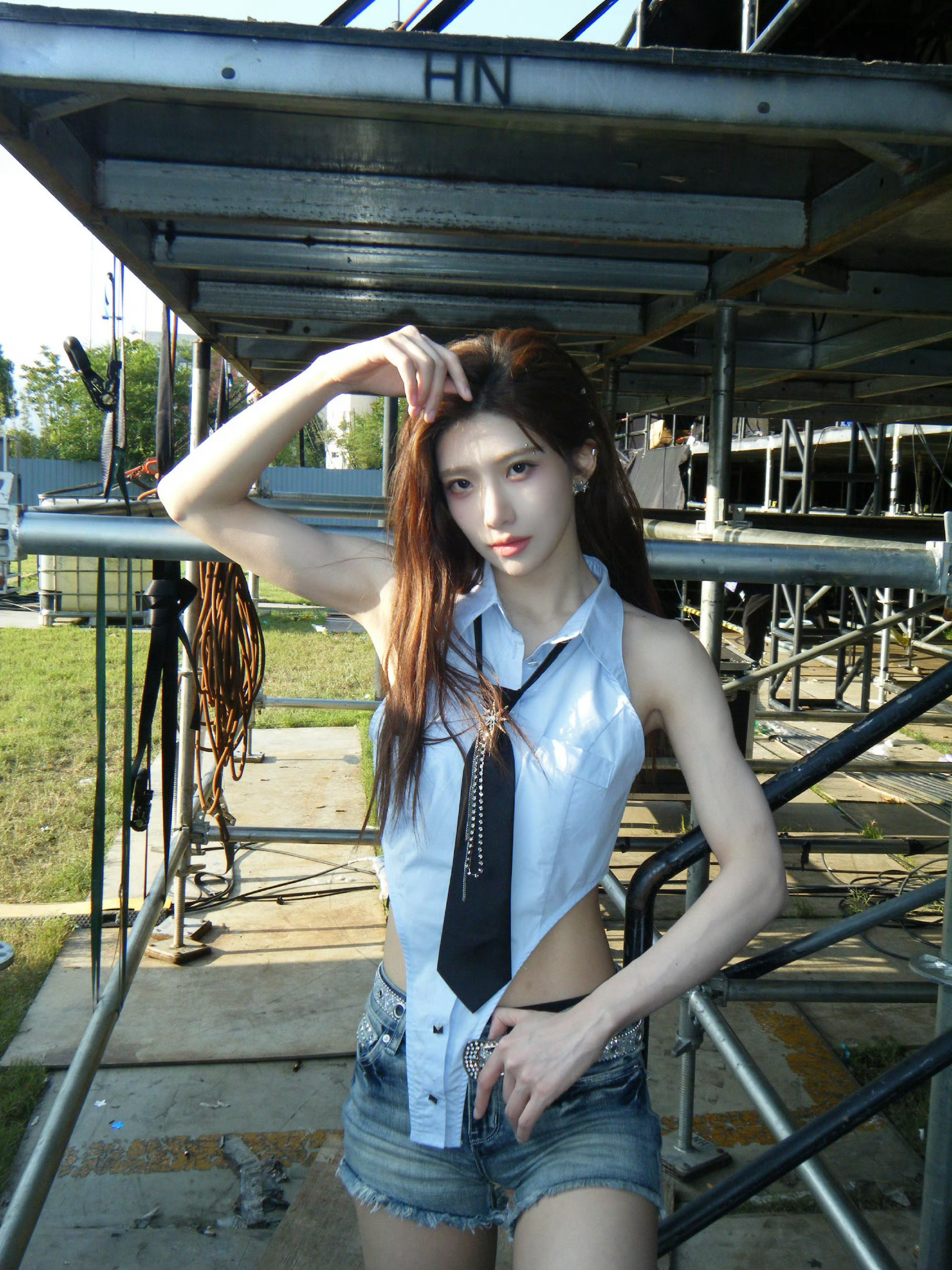 沈梦瑶 今晚最新营业🈶美式蓝色无袖衬衫+短裤,又辣又飒气场全开💙手臂线条利落