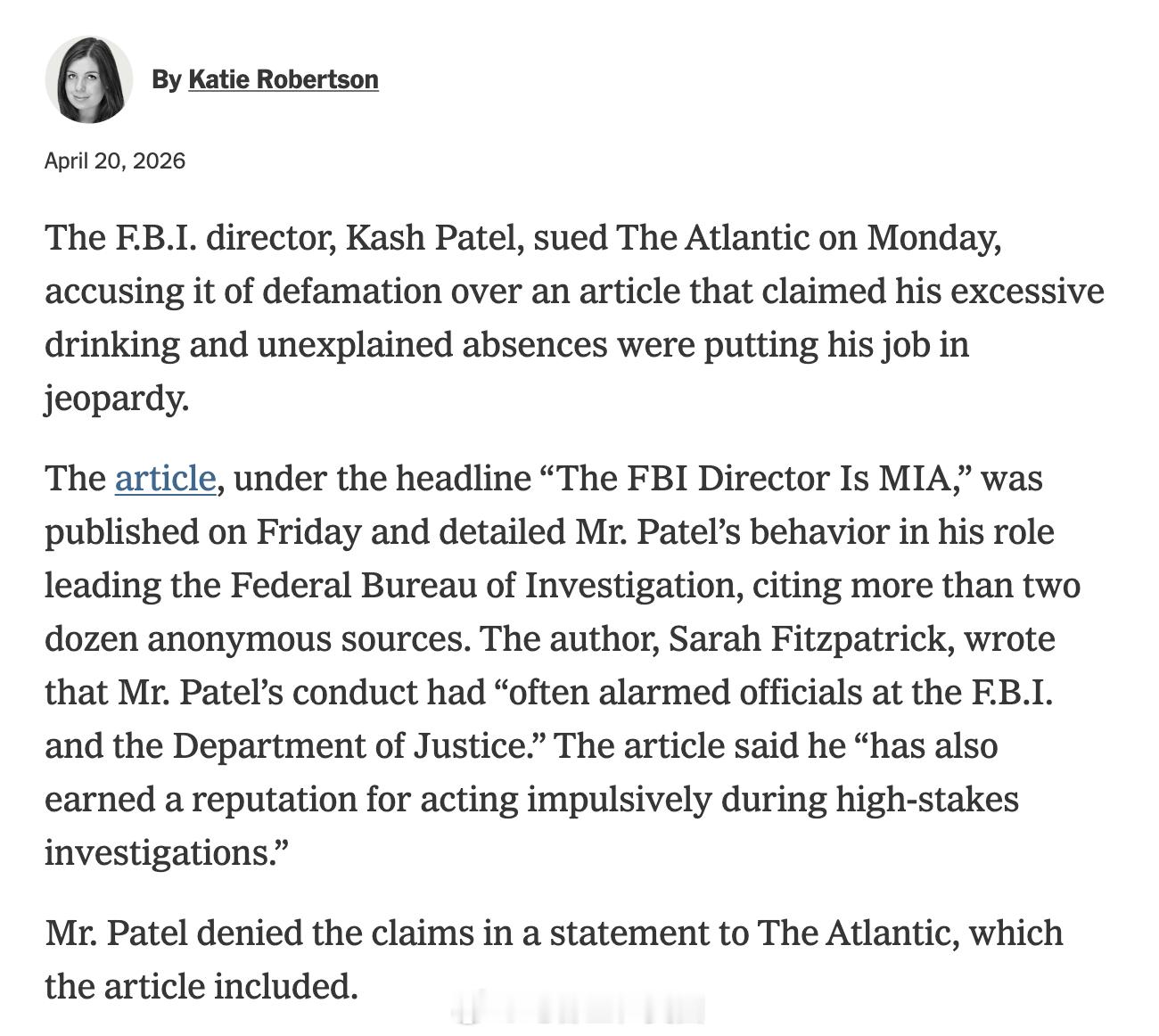 FBI局长Kash Patel在联邦法院起诉了杂志及其记Sarah Fitzpatrick。Patel声称该杂志在周五发表了一篇针对他的“全面、恶意且具有诽谤性的抹黑文章”,旨在损害他的名誉。