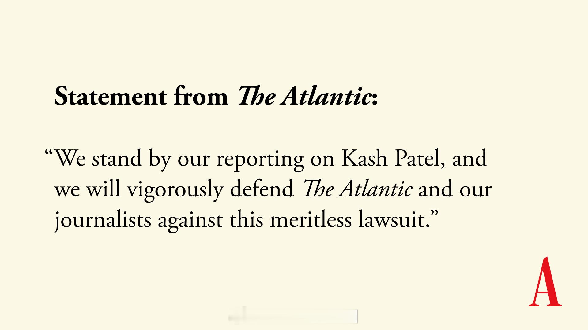 随后发表声明:我们坚持对Kash Patel的报道,并将坚决捍卫杂志及我们的记者,抵御这场毫无根据的诉讼。”