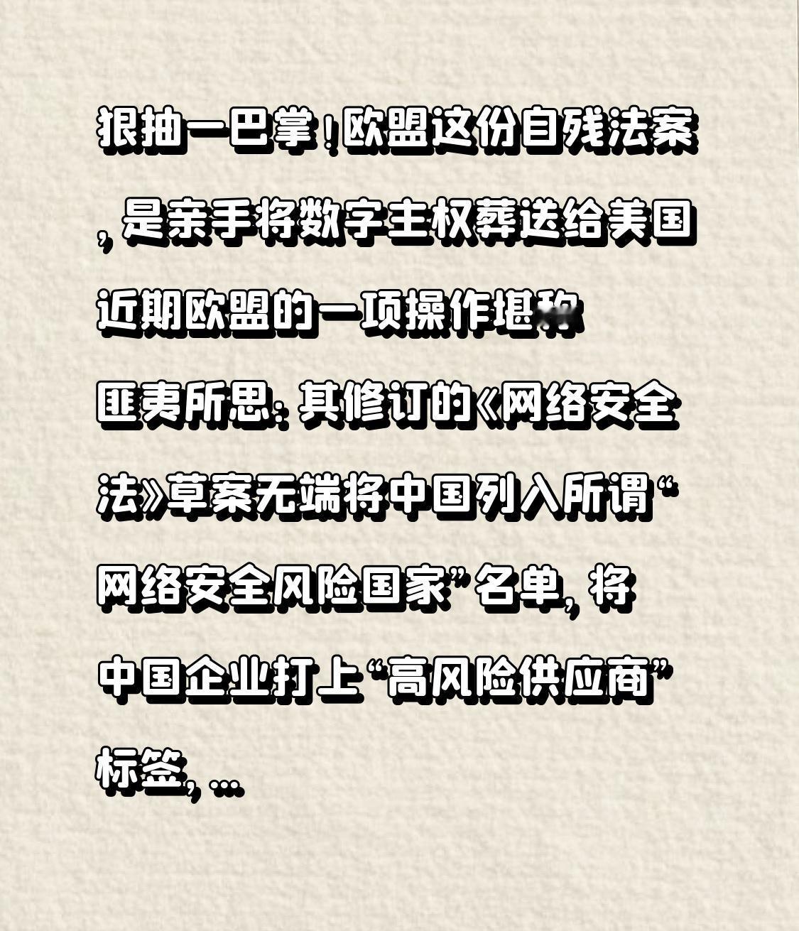 近期欧盟的一项操作堪称匪夷所思:其修订的《网络安全法》草案无端将中国列入所谓“网络安全风险国家”名单,将中国企业打上“高风险供应商”标签,这份充满偏见的法案,本质上不过是向美国递上的一份技术投名状。