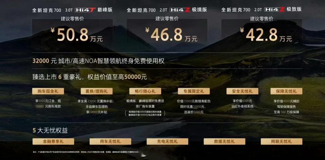 全新坦克700正式上市,Hi4-Z与3.0T Hi4-T双动力,售价42.8万-50.8万元。标配22寸轮毂、机械旋转激光大灯!车内7屏联动、21扬声器音响、前后排座椅通风加热按摩,Coffee Pilot 4.0搭载VLA大模型,支持全场景NOA与智能泊车。底盘有空气悬架与螺簧可选,前后双叉臂,舒适性与越野能力兼顾。总之这一次是把智能化装备全面提升,大G能干的它都可以,大G干不了它也可以全新坦克700新时代新旗舰麒麟云中现境启新人生