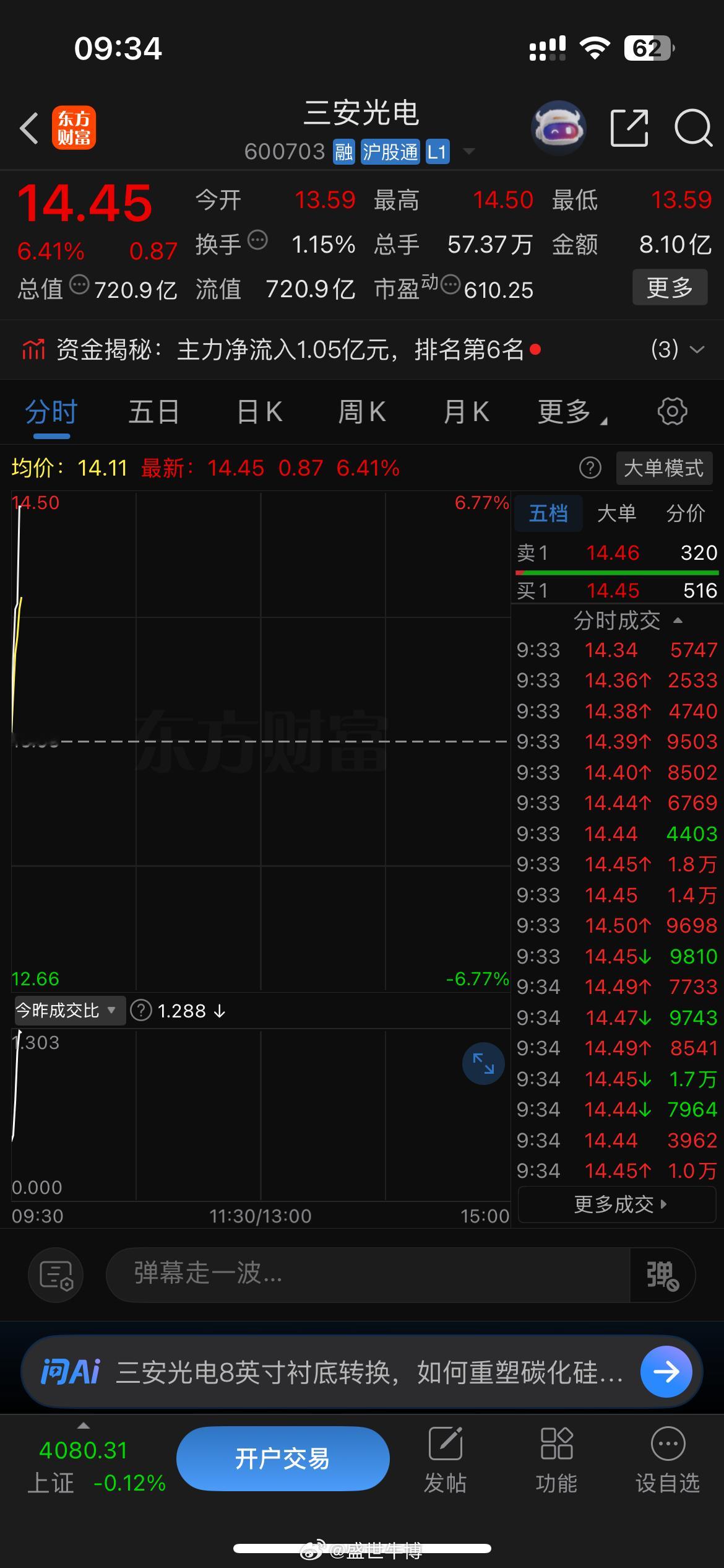 刚开盘我们的三安光电首先传来好消息,火箭发射,大家一起点赞评论777加油,等涨停