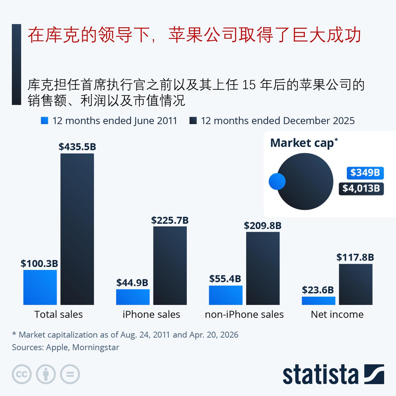 库克在任期间,成功带领苹果渡过多重危机,包括美国总统特朗普发起的贸易战、新冠疫情以及全球通胀飙升。与此同时,他稳步推动公司扩张,逐步降低对iPhone的依赖,如今仅苹果服务部门的年营收就超过1000亿美元。