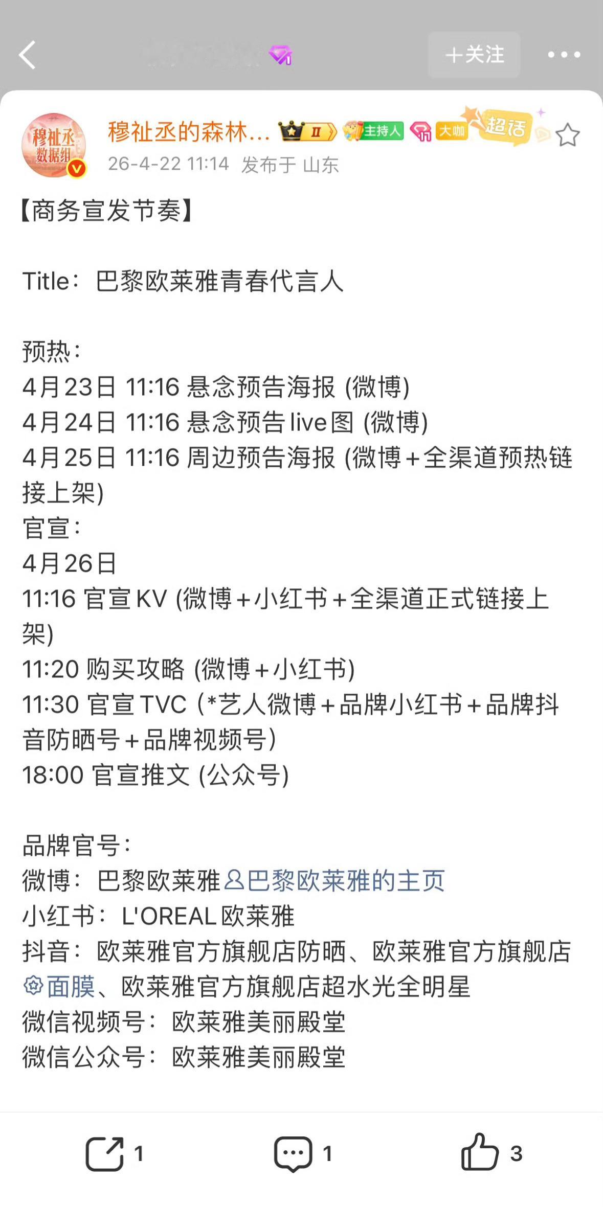 穆祉丞首个个人商务代言穆祉丞X欧莱雅 即将开启预热品牌直接跳过挚友、品牌大使的初