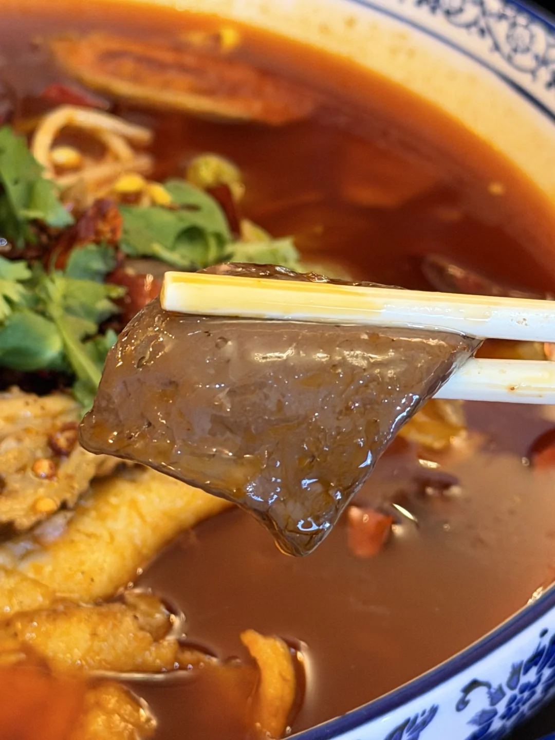 熟悉的菜有,新鲜的菜也不缺。从那里种草、我最期待的毛血旺没让人失望!这个血旺是嫩ferfer的(图3),口感软滑吃得出新鲜,不像有的店那种面面的口感。一大盆热辣汤底里还有肥肠、鱼片、牛肉等等很丰富,三四个人分着吃最佳。老板说味道正宗的关键在于海椒花椒都是从成都盘过来的(跟我家一样),这也是唯一可以维持家乡味的办法。