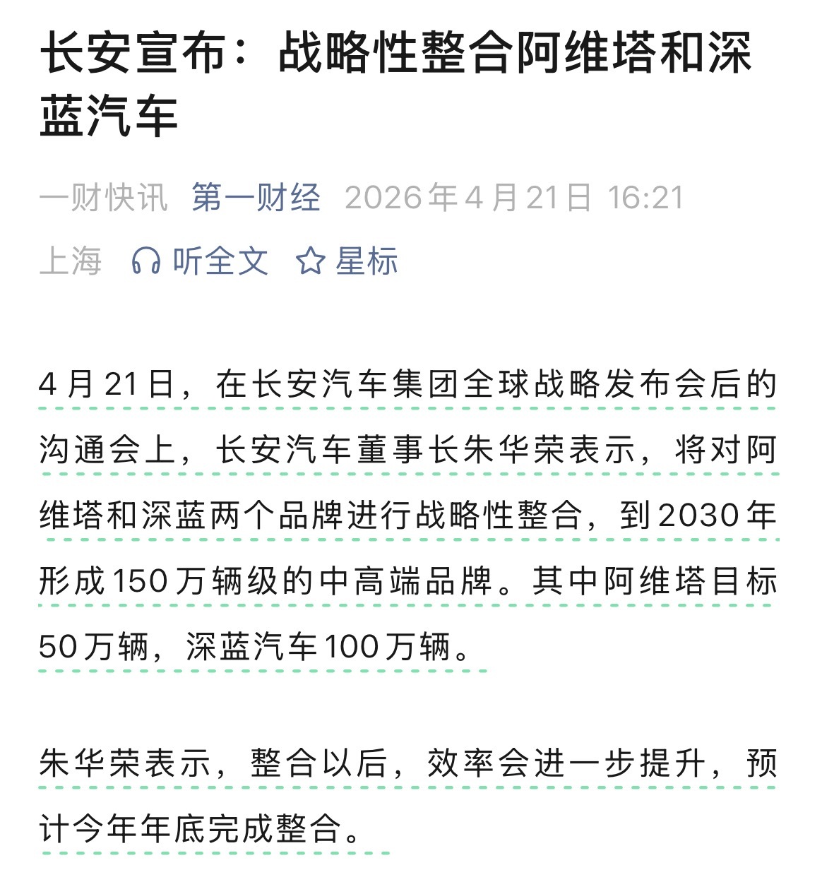 长安汽车将整合阿维塔和深蓝长安汽车董事长朱华荣表示,将对阿维塔和深蓝两个品牌进行战略性整合,到2030年形成150万辆级的中高端品牌。其中阿维塔目标50万辆,深蓝汽车100万辆。朱华荣表示,整合以后,效率会进一步提升,预计今年年底完成整合。在传统车企的新品牌中,深蓝和阿维塔都属于卖得比较好的。所以长安这一步还真是令人意外。现在有一个问题是,二者整合后,阿维塔上市是否会受影响呢?汽场全开
