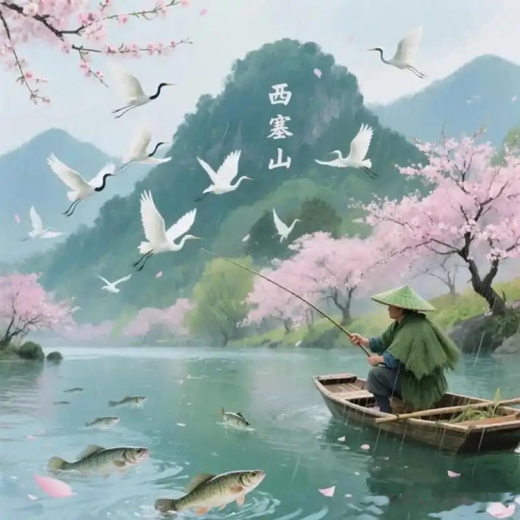 西塞山前,白鹭在自由地飞翔,江岸两边,桃花盛开,时值春水初涨,水中的鳜鱼长得正是肥美。