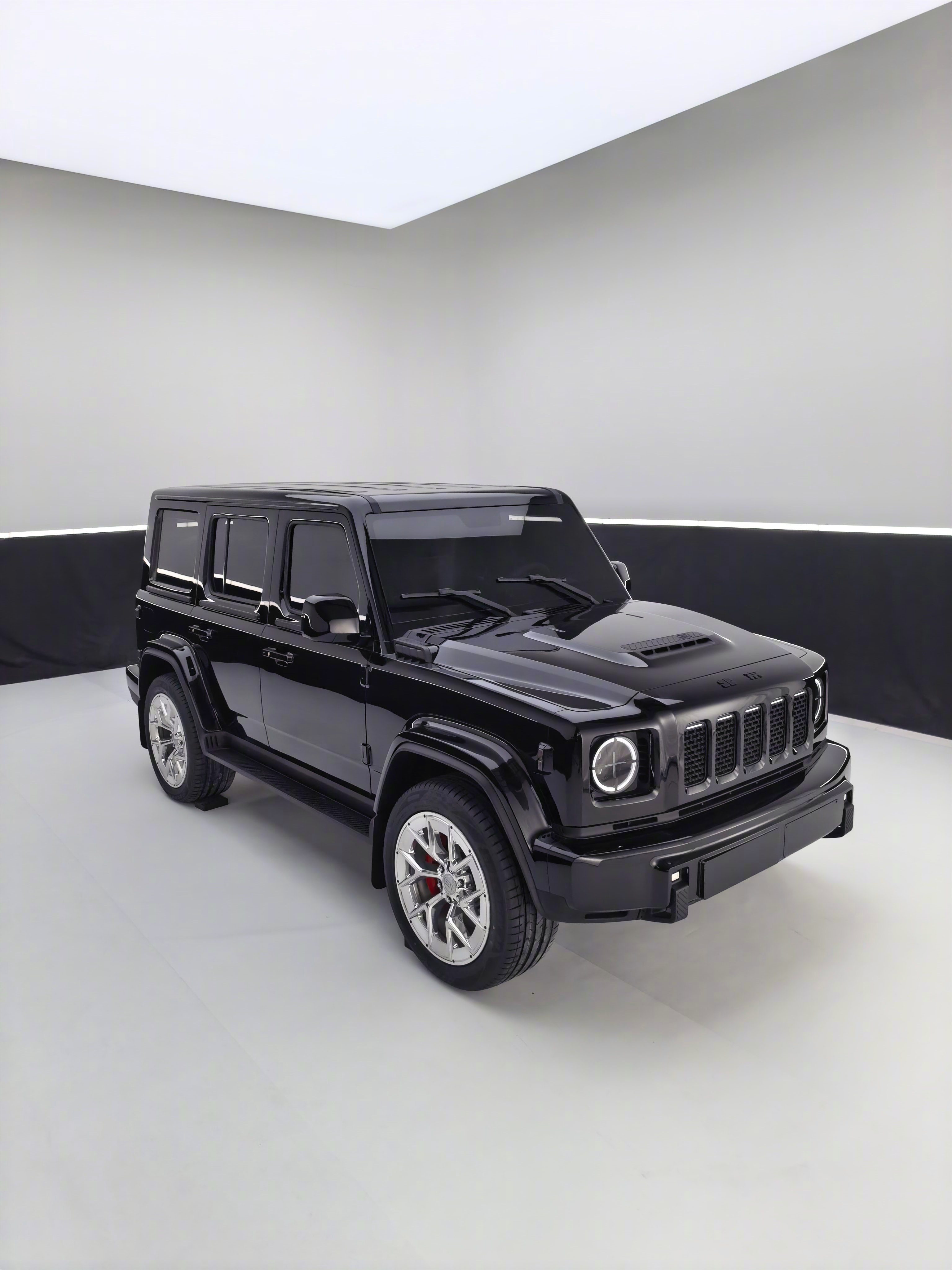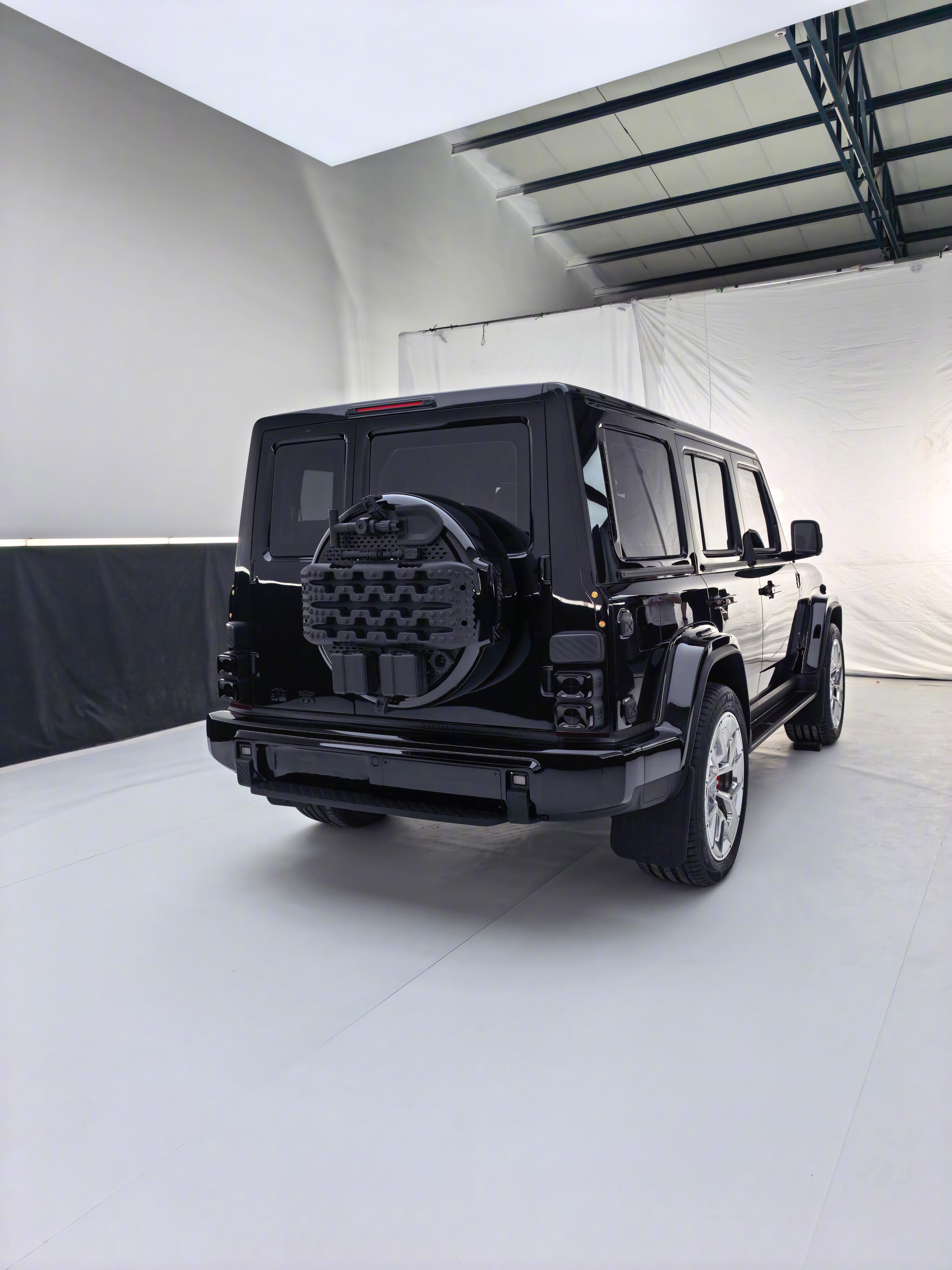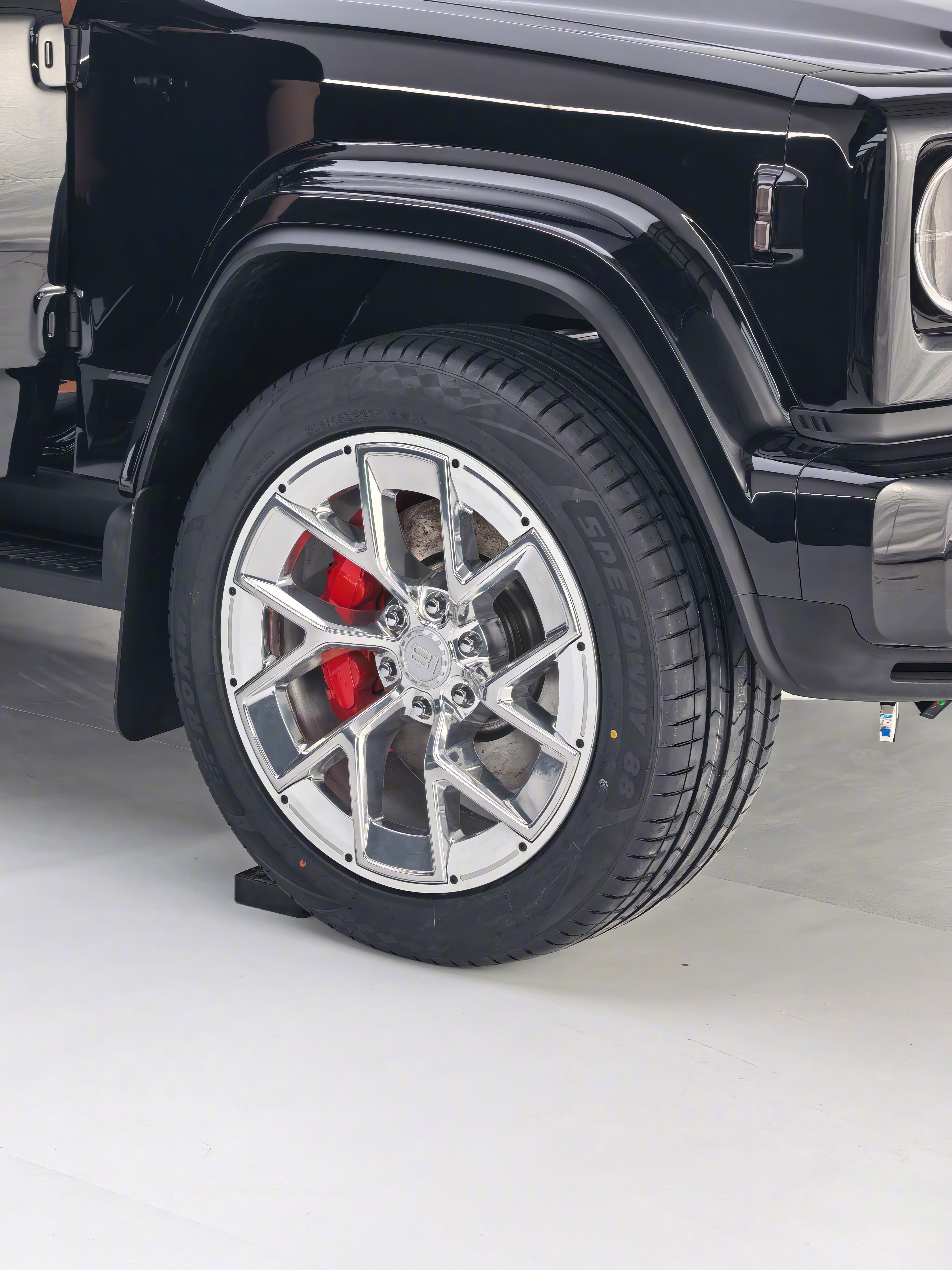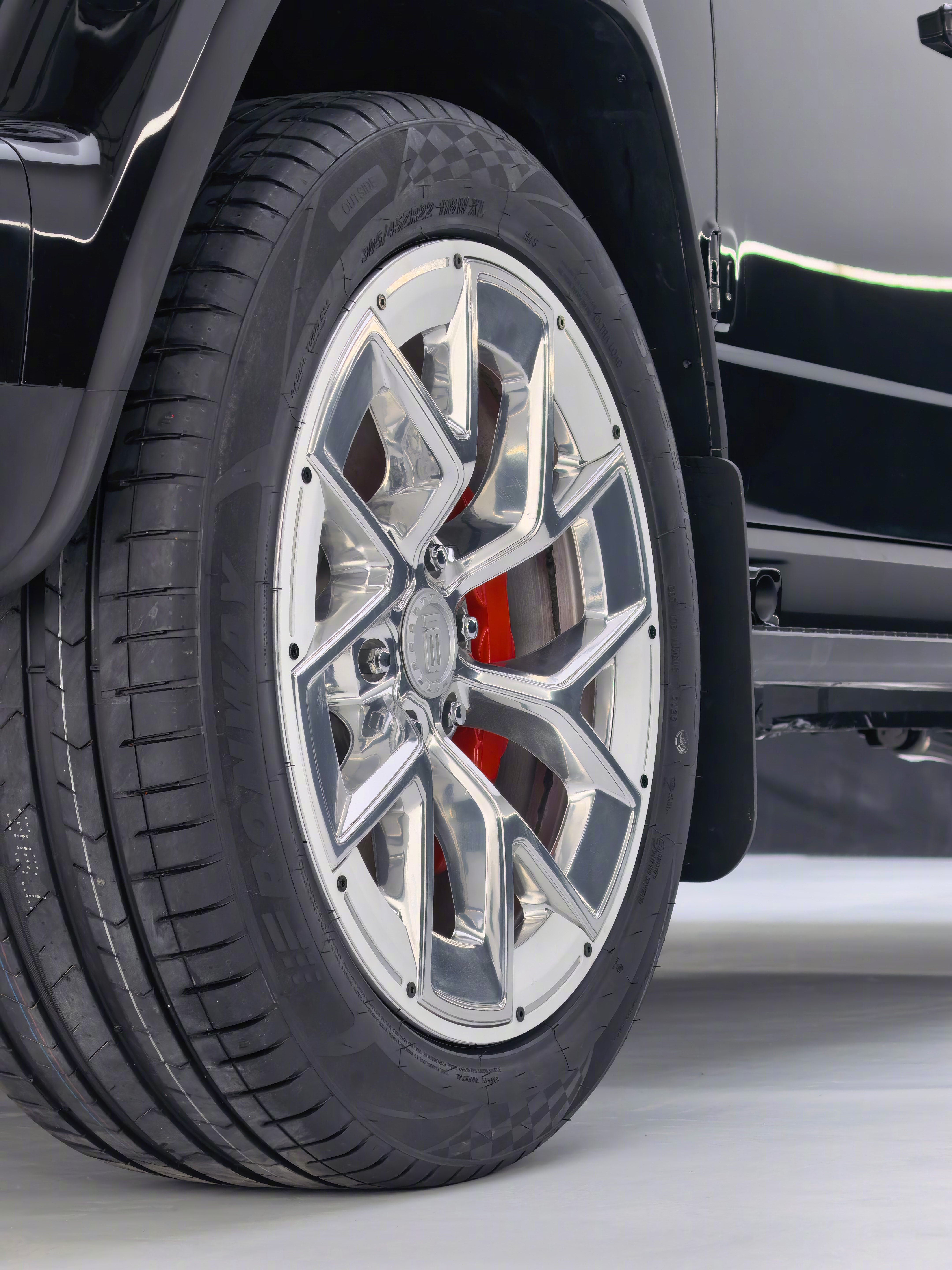 305/45/22的轮子,并且确认是最终原厂标配,并且轮子极度的卡边儿,并且是电镀抛光的大轮子,这也太爽了,买回来绝对不用再换别的轮子了。另外轮胎方面儿我们也查了一下,二线的这些小厂竟然有这个尺寸的越野胎,经常出去玩你还能换个越野胎,更虎一点儿。