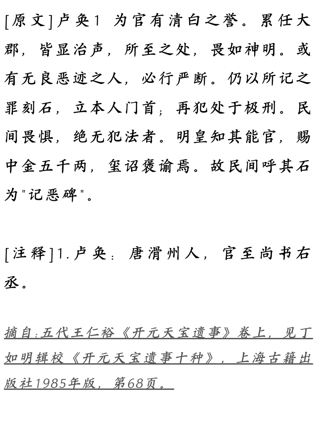 唐朝官员卢奂,在地方任职时政绩斐然,所到之处百姓敬畏如神明。他处理恶人的方法很独特: 凡是犯法者,不但依法严惩,还要将他们的罪行刻在石碑上,立在本人的大门口。如果此人再次犯法,则直接处以极刑。