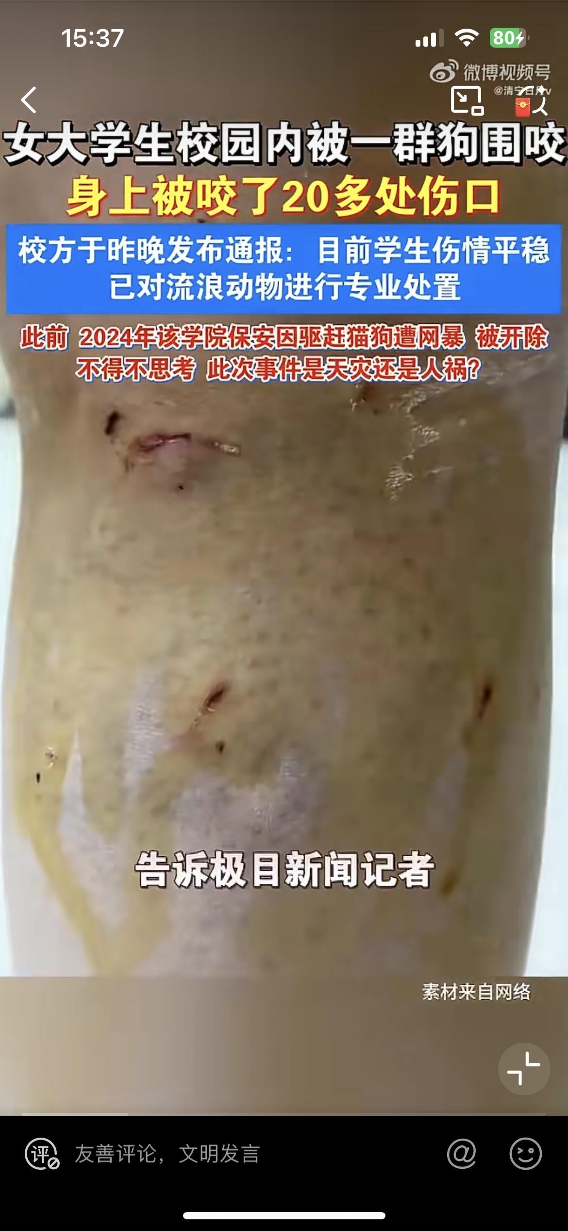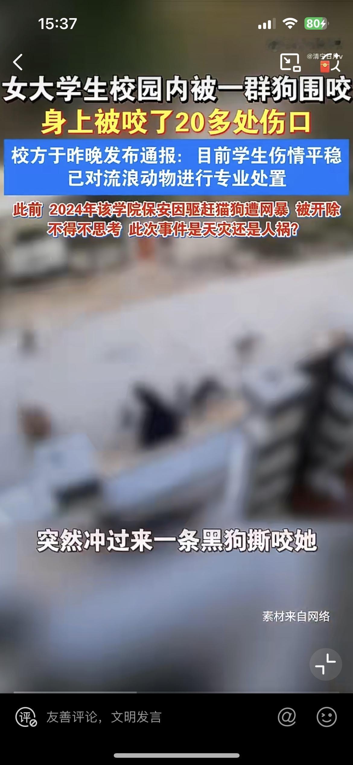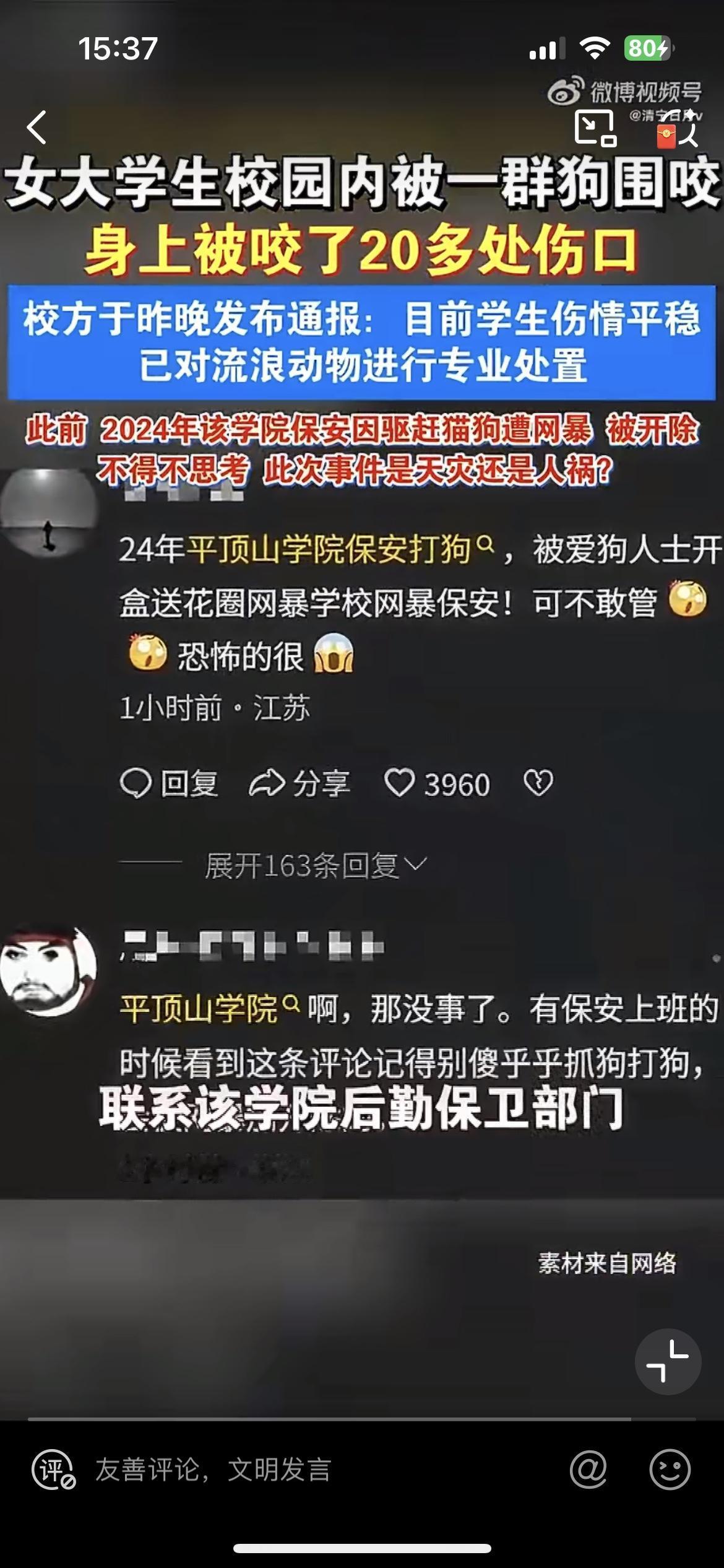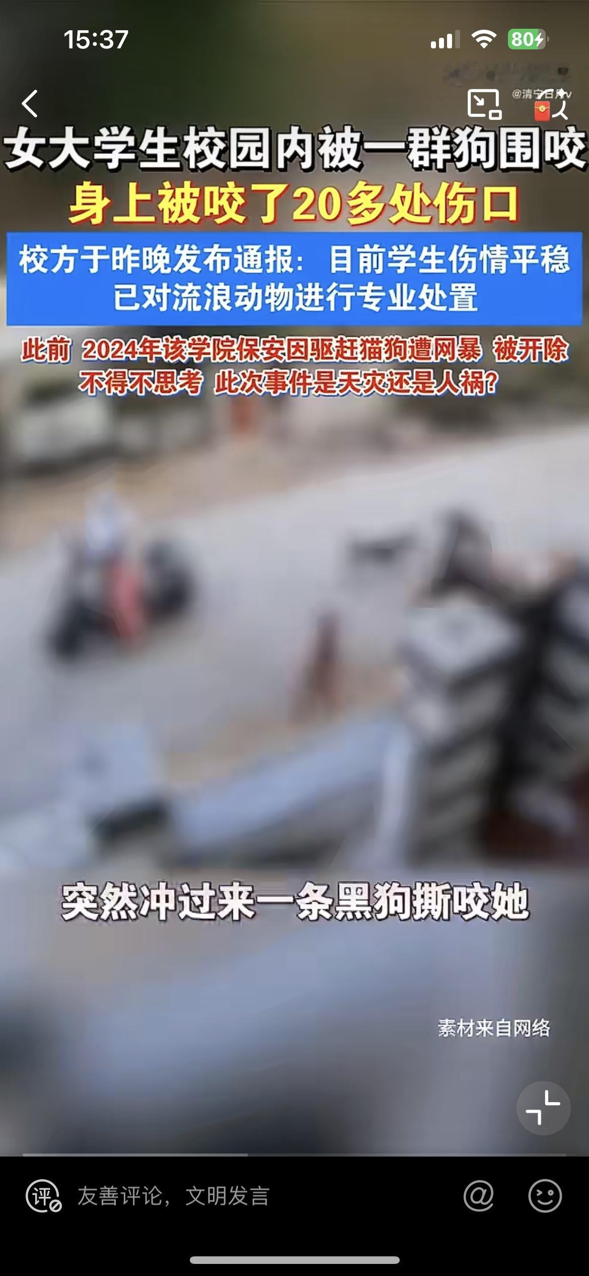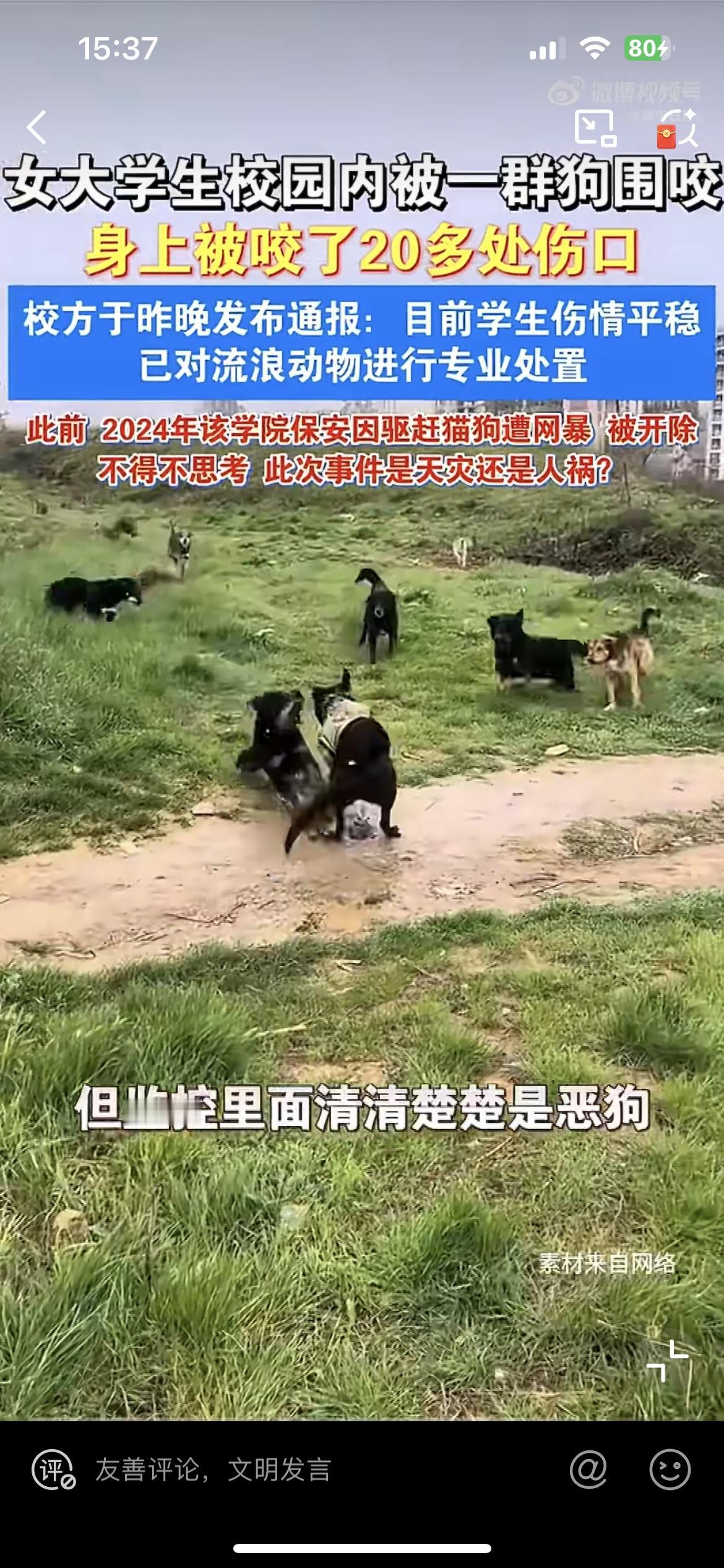 平顶山学院一大三女生校园内遭一群疯狗撕咬,比较讽刺的是,2024 年该校保安打流浪狗,遭到爱狗人士网暴。今天的恶果就是那一群网暴的人造成的,学校保安维护校园安全,打击流浪狗,因此被开除。后面学校流浪狗泛滥成灾,却没有保安敢出手,学校也睁只眼闭只眼。