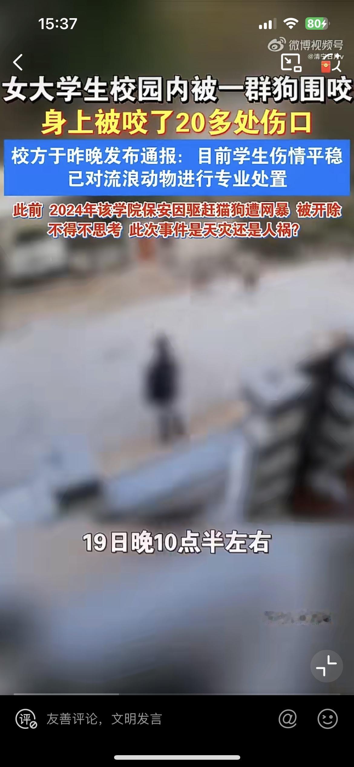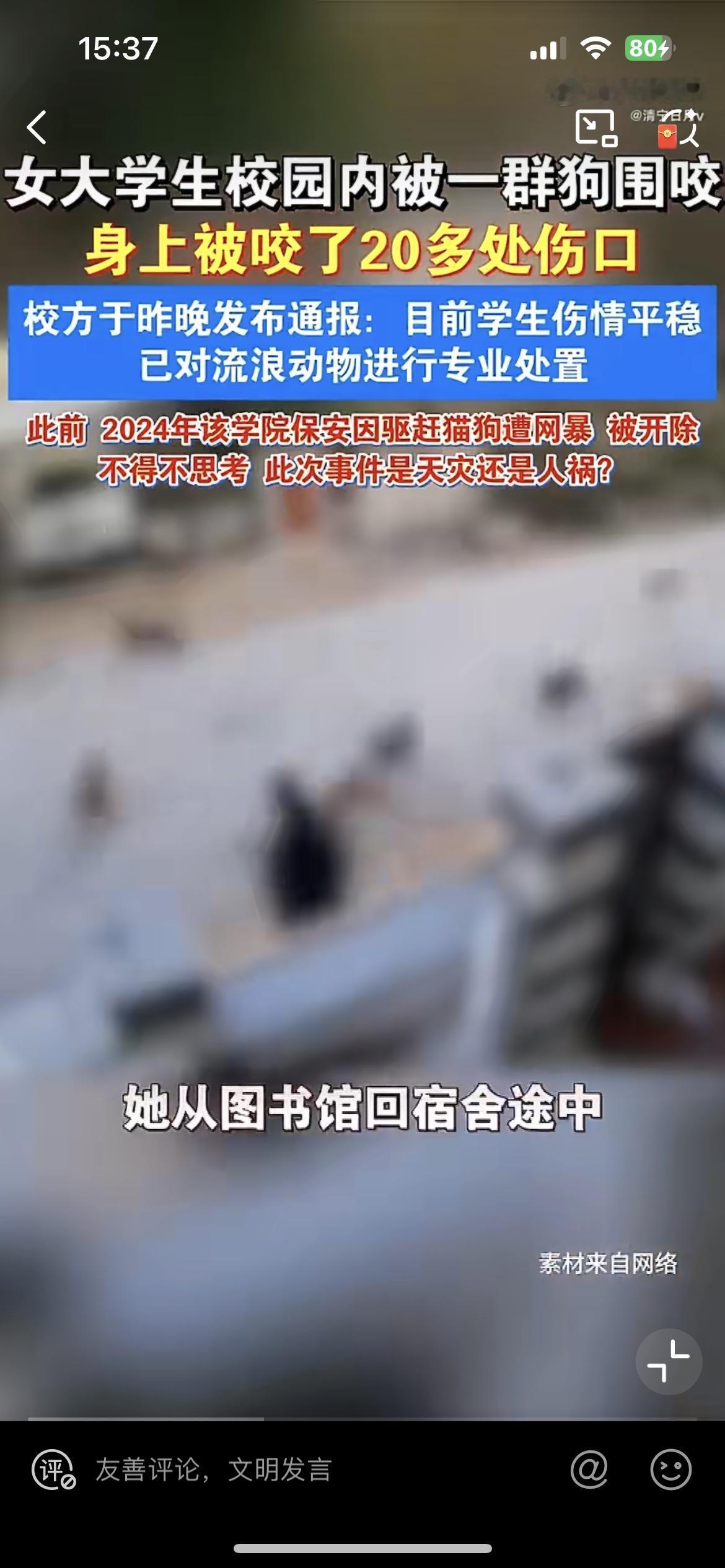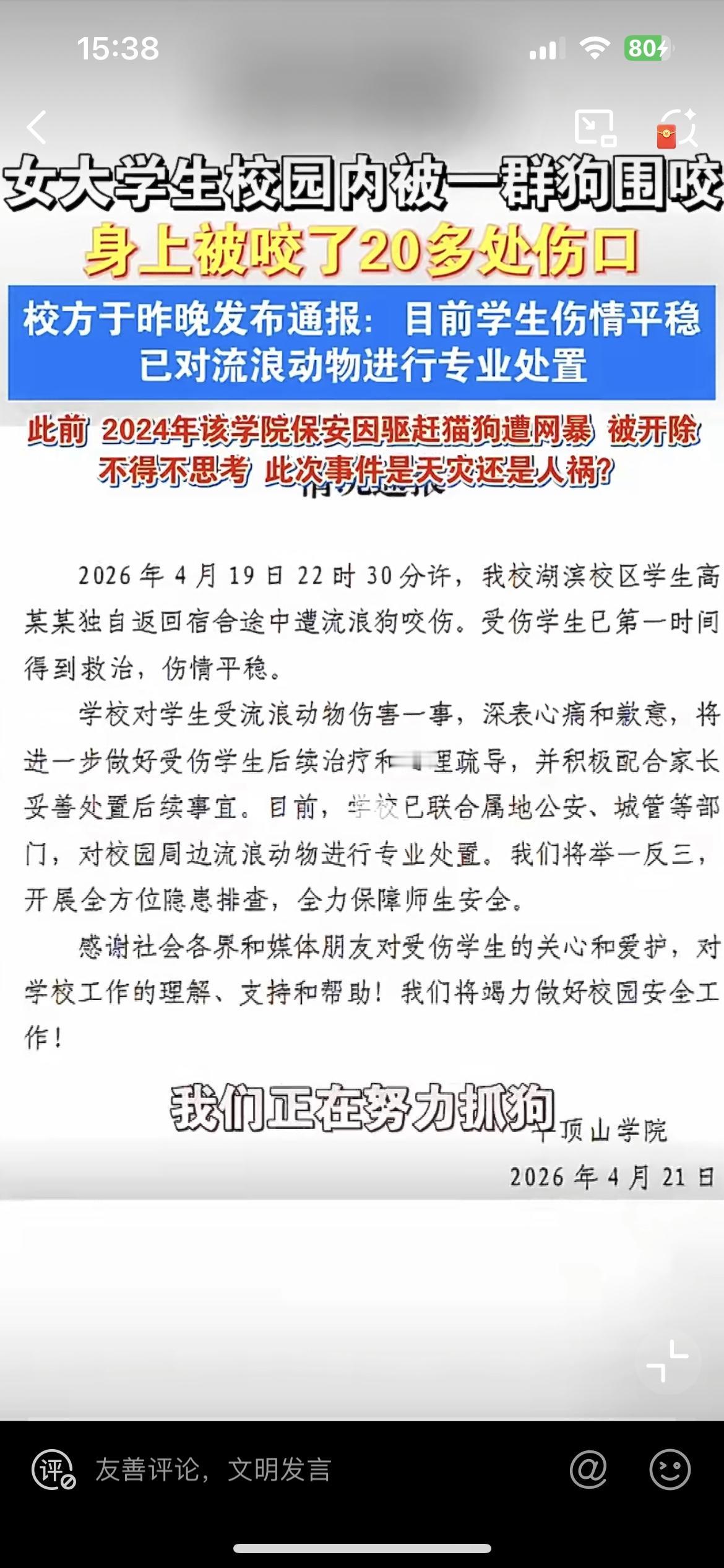 终于在 2026 年 4 月 19 日。造成了一场悲剧,一名女生在学校图书馆附近,突然遭遇一群流浪狗的袭击,浑身多处被咬伤,幸得一路过的男生骑着电瓶车驱赶流浪狗,才没有造成更大的伤害。这些爱狗人士都来看看吧,宠物狗你们可以爱,但是这些已经发疯的疯狗,如果你们想爱,就把它带回家。别让它在外面流浪,伤害无辜的人。