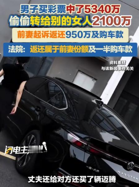 黑龙江哈尔滨,一男子买彩票中了11注一等奖,税后奖金5340万元,随后果断与妻子离婚。离婚后妻子才发现,男子竟在婚内出轨,甚至还将其中的2100万元奖金给了情人,还给情人买了一辆大众迈腾。妻子认为这些奖金和汽车都是夫妻共同财产,于是将男子和他的情人告上了法院,要求男子情人返还950万元以及购车款。法院判了!