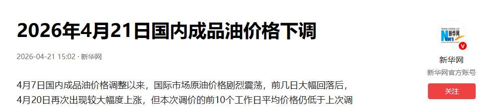 或许有人会疑惑,前段时间布伦特原油突破100美元/桶,咱们为何还能下调?4月7日国内成品油调价后,国际原油价格虽剧烈震荡,4月20日还出现大幅上涨,但本次调价前10个工作日的一揽子国际原油平均价,仍低于上一轮调价前的平均价,按照调控机制,自然启动下调。