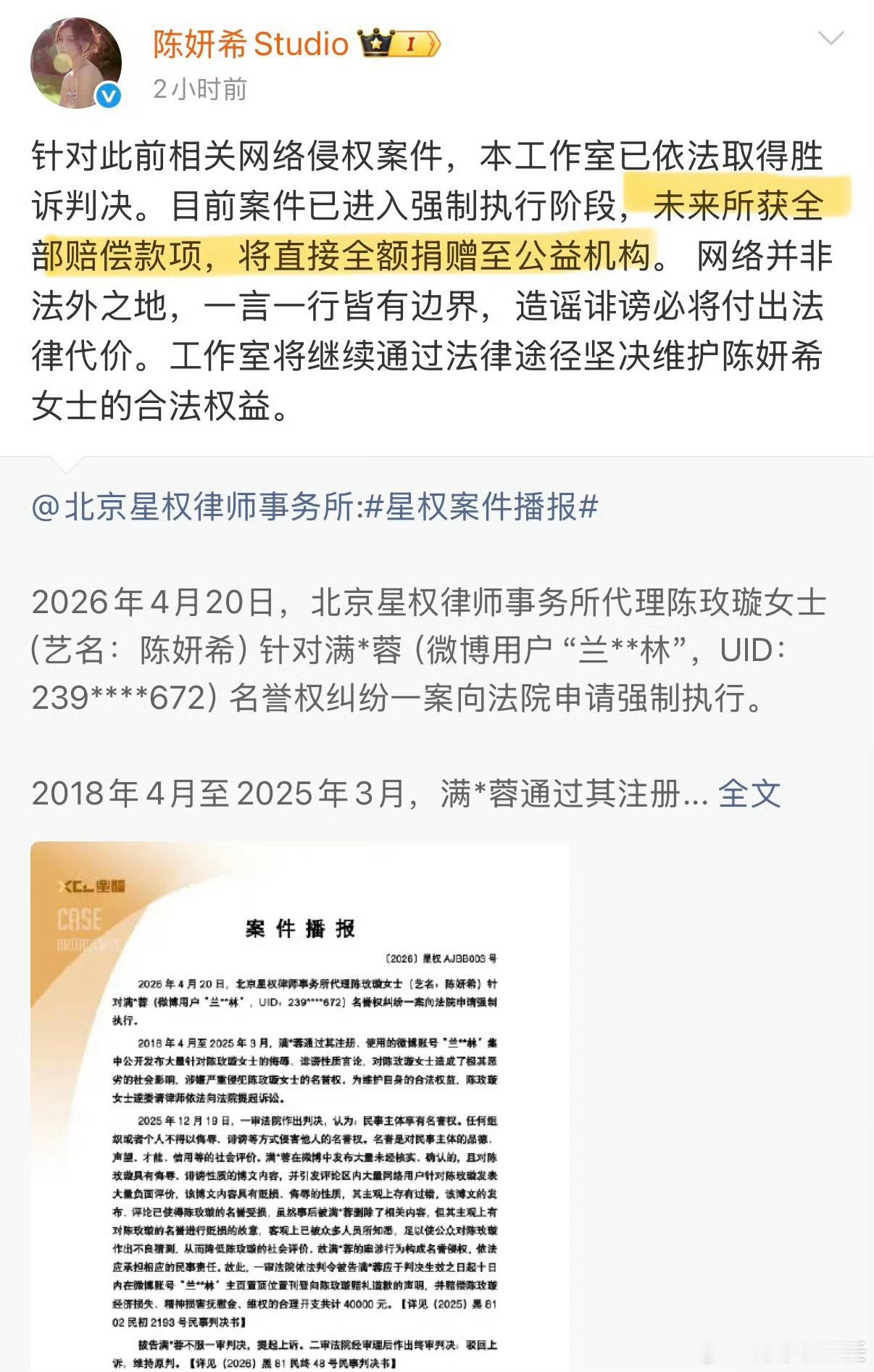 陈妍希告了陈晓粉丝 陈妍希告了陈晓大粉,目前已经进入强制执行阶段,工作室称将会把全部赔偿捐给慈善机构。长达近十年的造谣辱骂,离婚了也确实不需要体面了