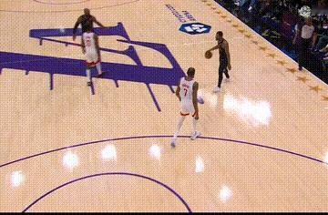 图二、三、四:詹姆斯借掩护佯装左路突破,轻松晃开杜兰特完成空中折叠大风车灌篮,这可不是一个41岁老头该干的事儿;