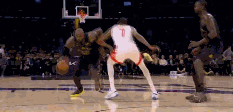图五、六:詹姆斯外线外线连续胯下运球摆脱史密斯完成左手上篮,就这球,谁还敢说詹姆斯运球不行;