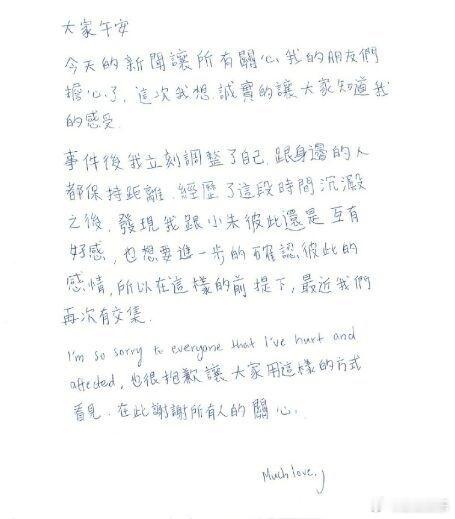 吴卓源承认与朱轩洋复合 22日,吴卓源手写信回应与朱轩洋复合,表示:“我跟小朱彼此还是互有好感,也想要进一步确认彼此的感情,所以在这样的前提下,最近我们再次有交集。”去年4月,朱轩洋被拍到出轨歌手吴卓源,在公园叠坐接吻;近日又被拍到朱轩洋回吴卓源家过夜。太爱了
