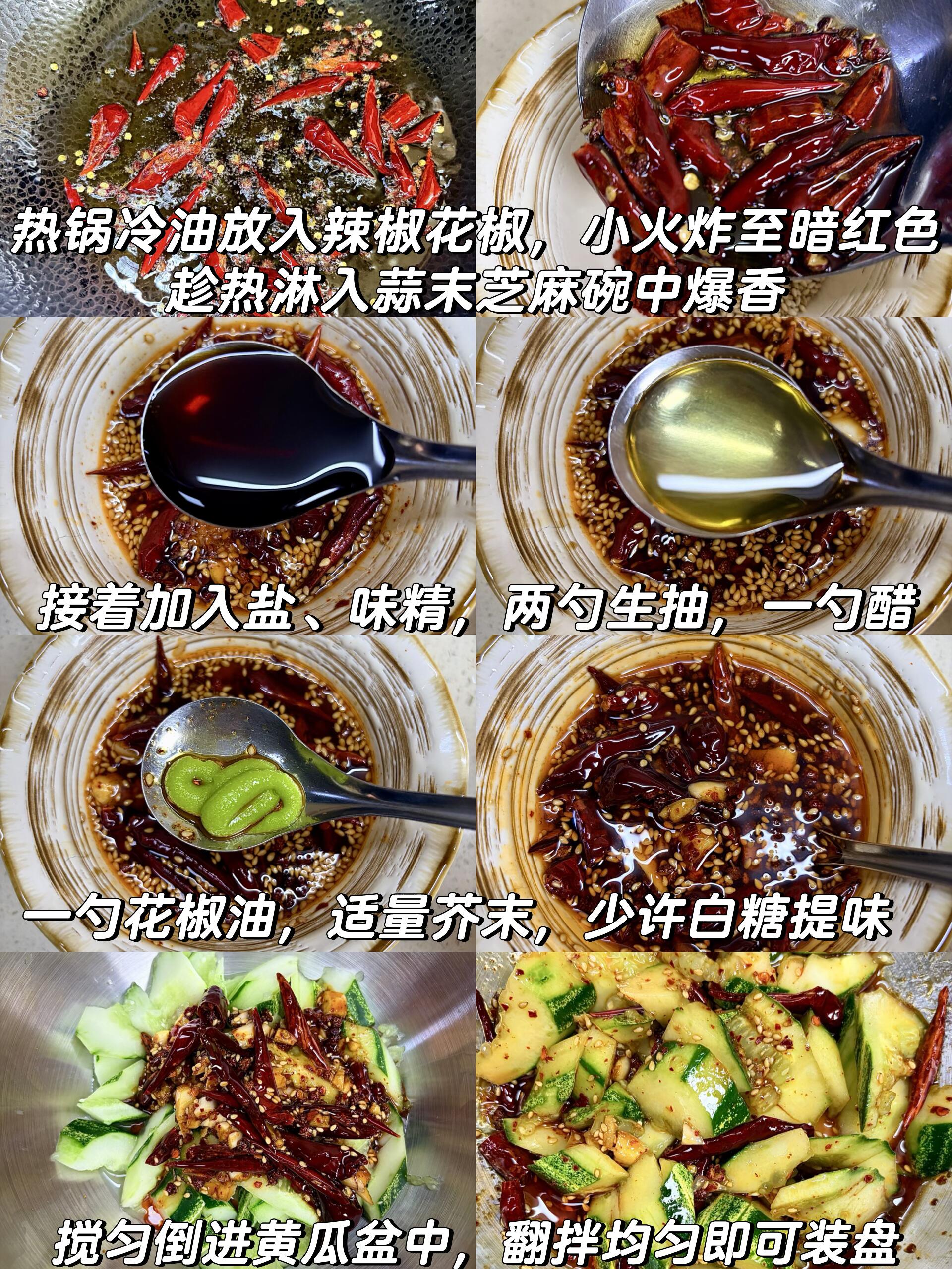 黄瓜 ×2根、干辣椒、花椒、蒜末、辣椒粉、白芝麻