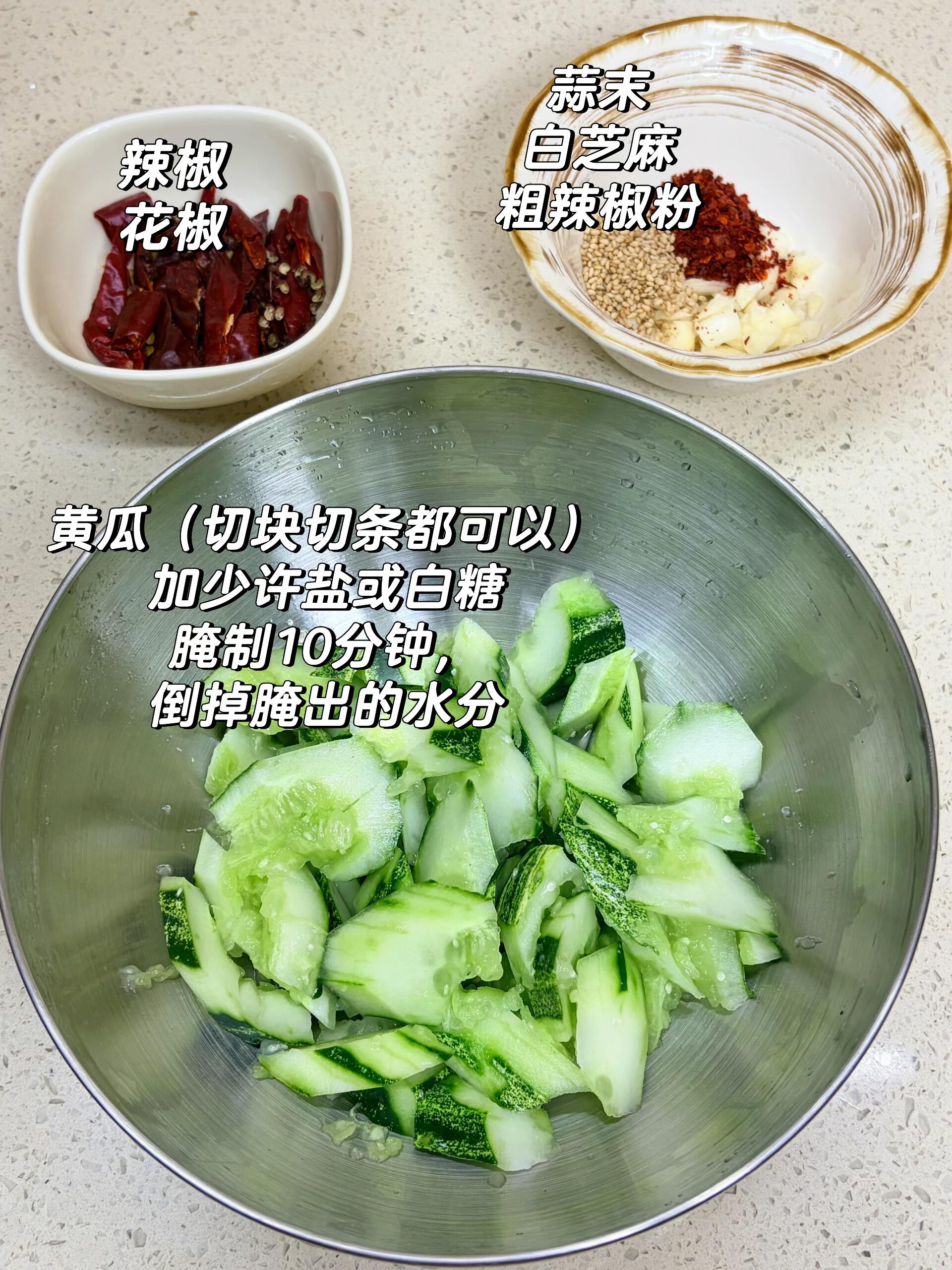1️⃣ 黄瓜用刀拍扁,再切成小段,加少许盐或者白糖,抓匀腌制10分钟,然后把腌出来的水分倒掉,这样处理后的黄瓜会更脆爽,不容易软塌。