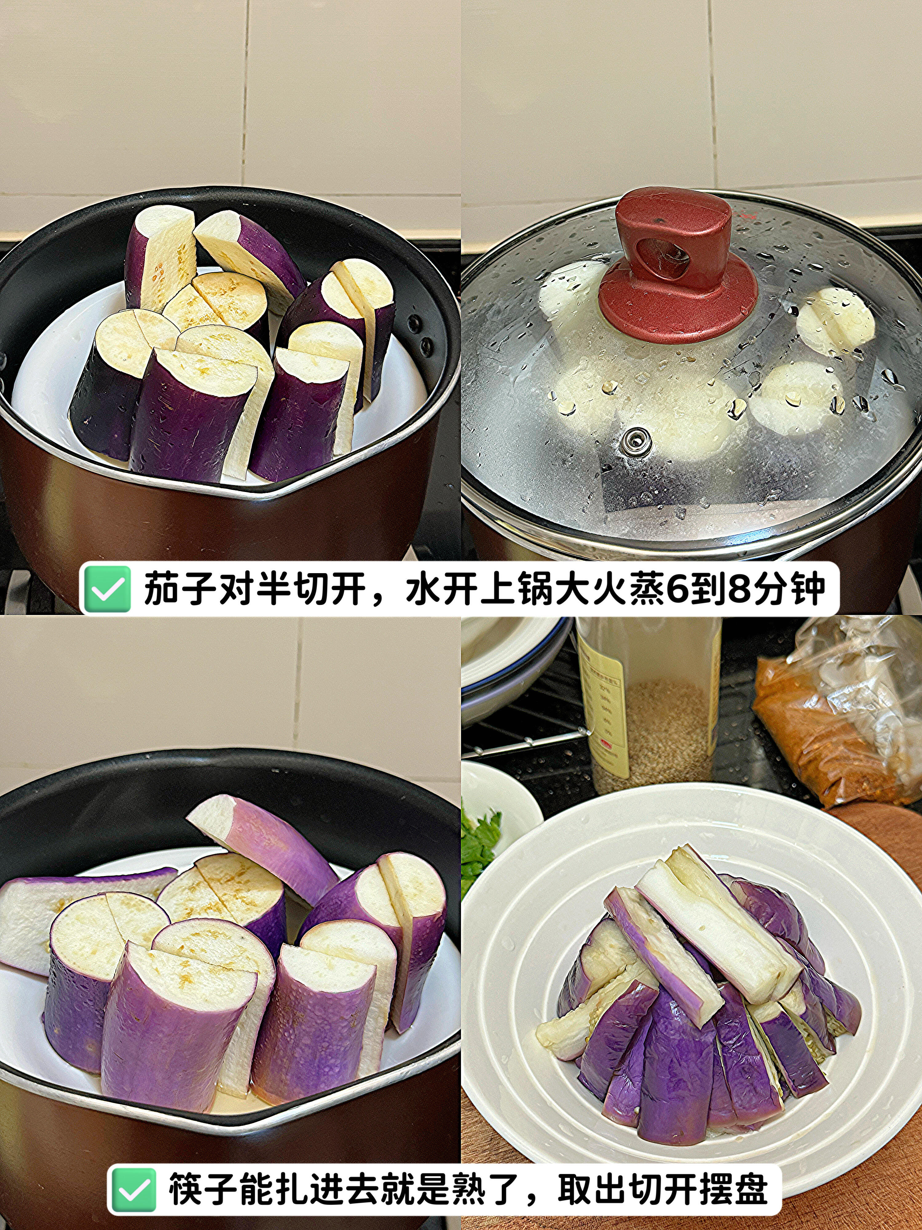 1. 茄子对半切开,水烧开后上锅,大火蒸6到8分钟,蒸至软嫩。