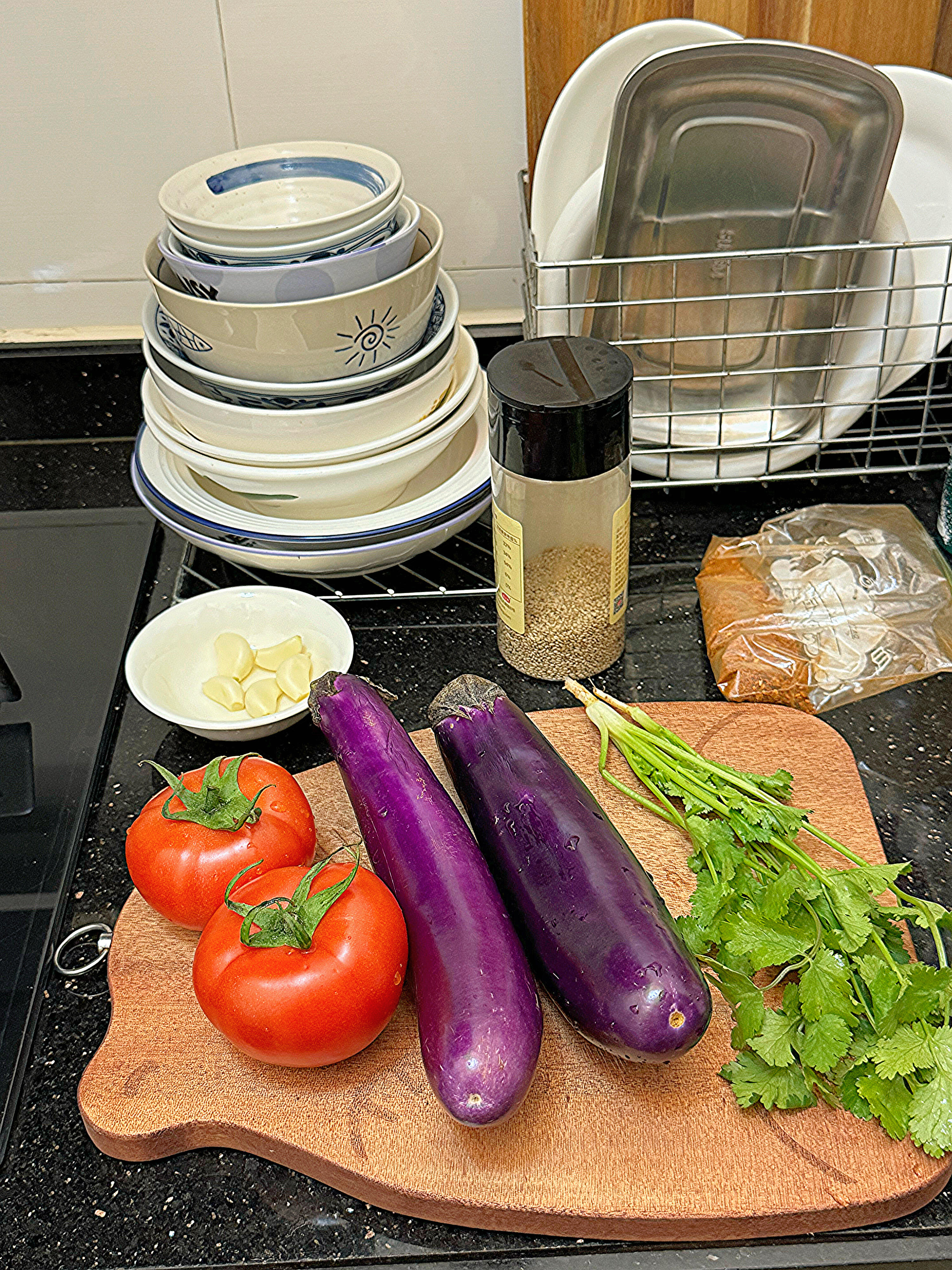 茄子、番茄、香菜、蒜、芝麻、辣椒面
