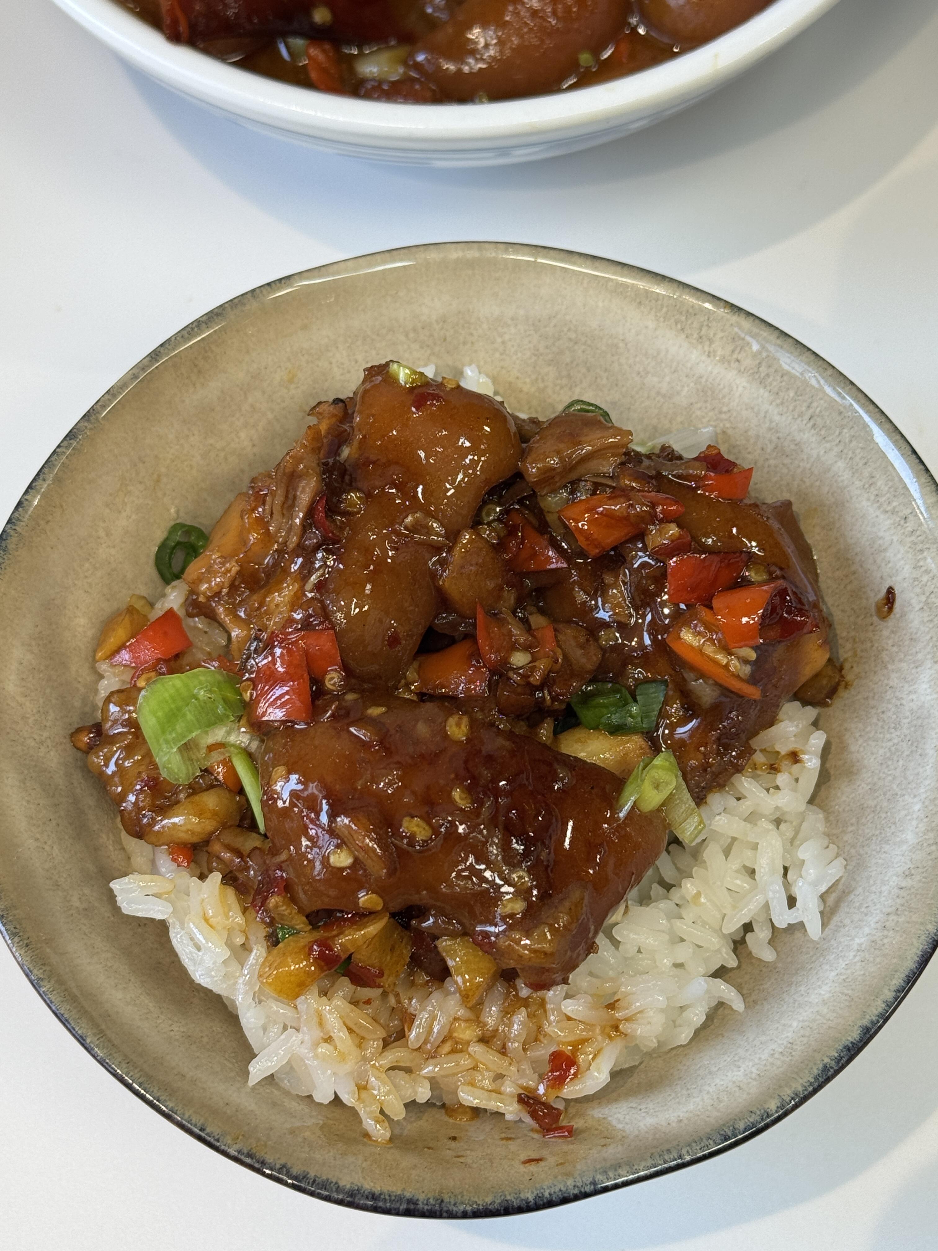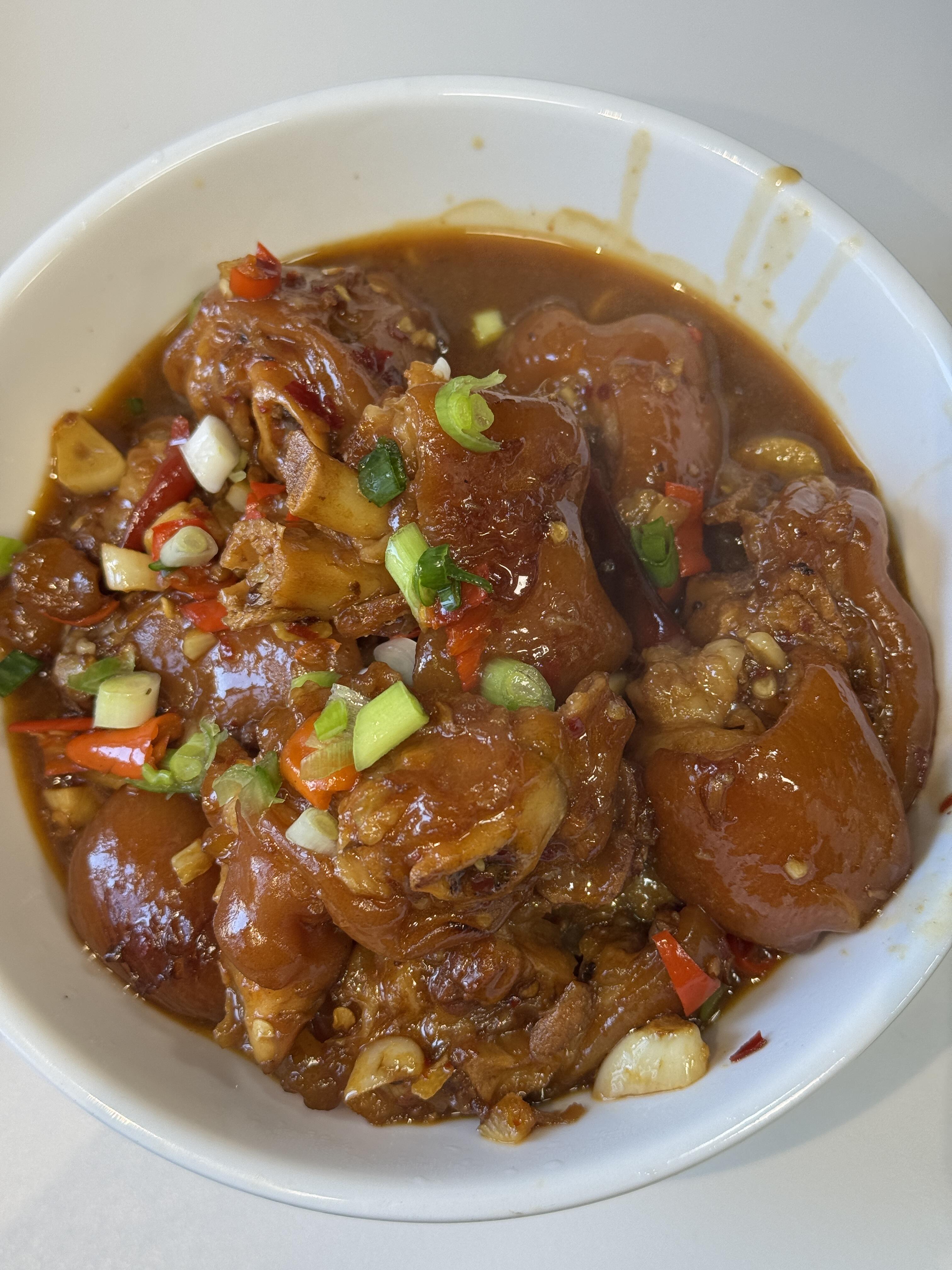 家人们,这道香辣猪脚真的越吃越上头!炖得软烂到一抿即化,外皮Q弹黏嘴,每一块都吸满了香辣酱汁,入味又不腻,浇上一勺汤汁拌米饭,香到停不下来~
