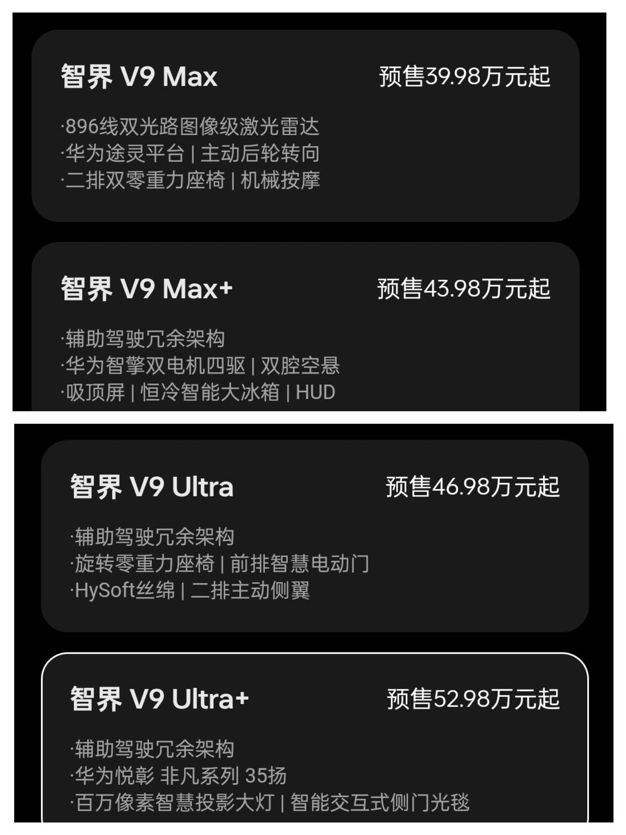 鸿蒙智行首款MPV智界V9,预售价39.98万元至52.98万元。这个价格倒是符合产品定位,但能不能一炮而红,还得看最终上市价格,再等等看吧。