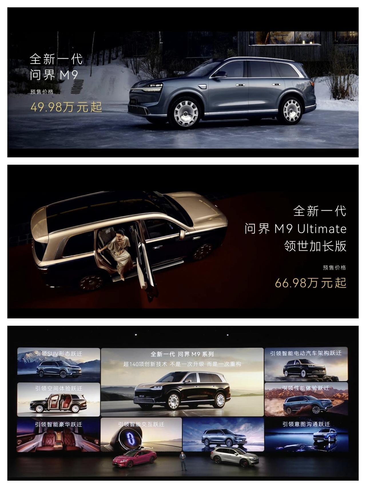 新一代问界M9预售价49.98万元起;问界M9 UltiMate领世加长版预售价66.98万元起。特别说一下这个加长版,5.42米的车身长度,非常夸张的一个尺寸,内部空间很大,有四座、五座和六座三个版本。