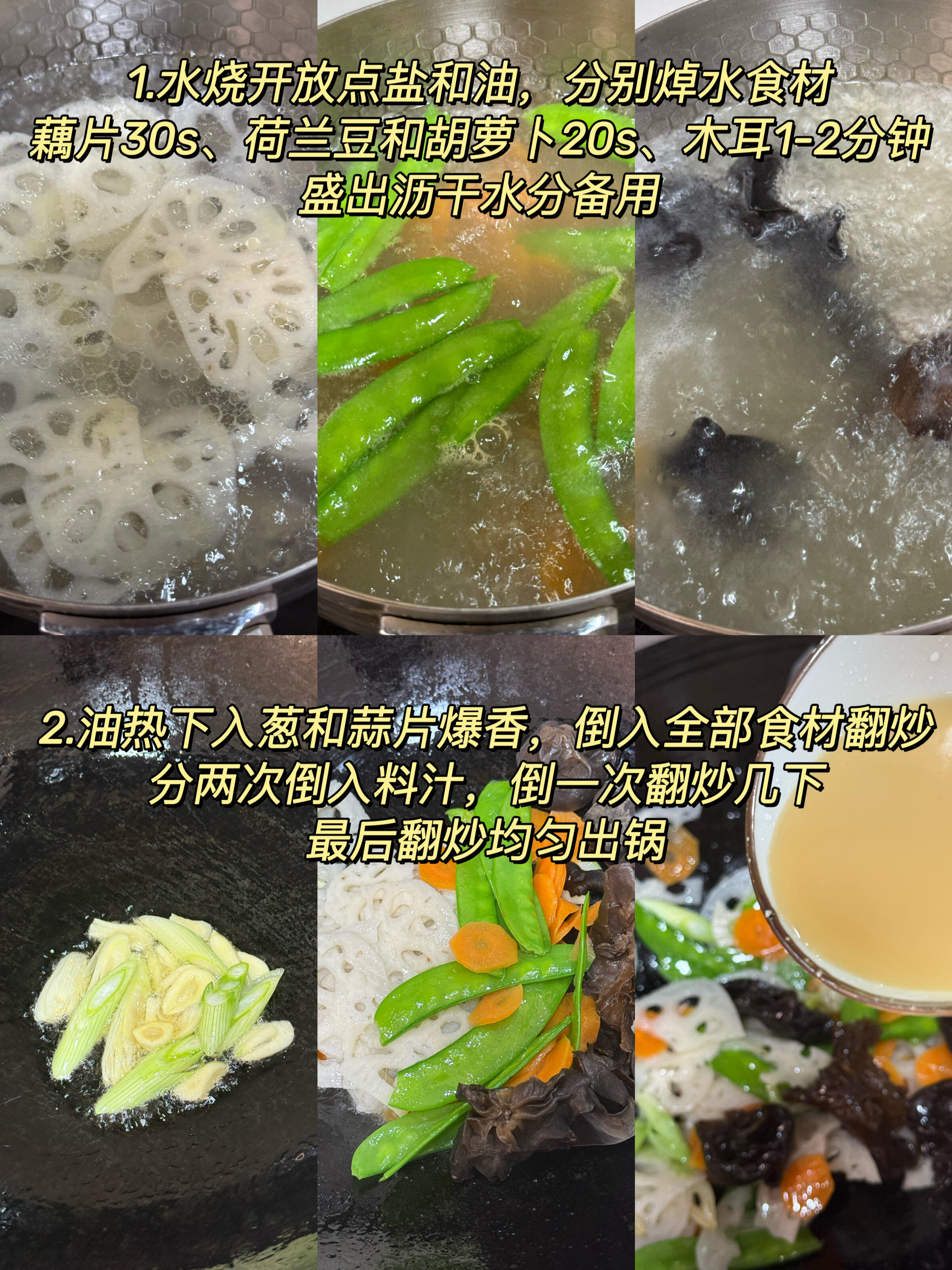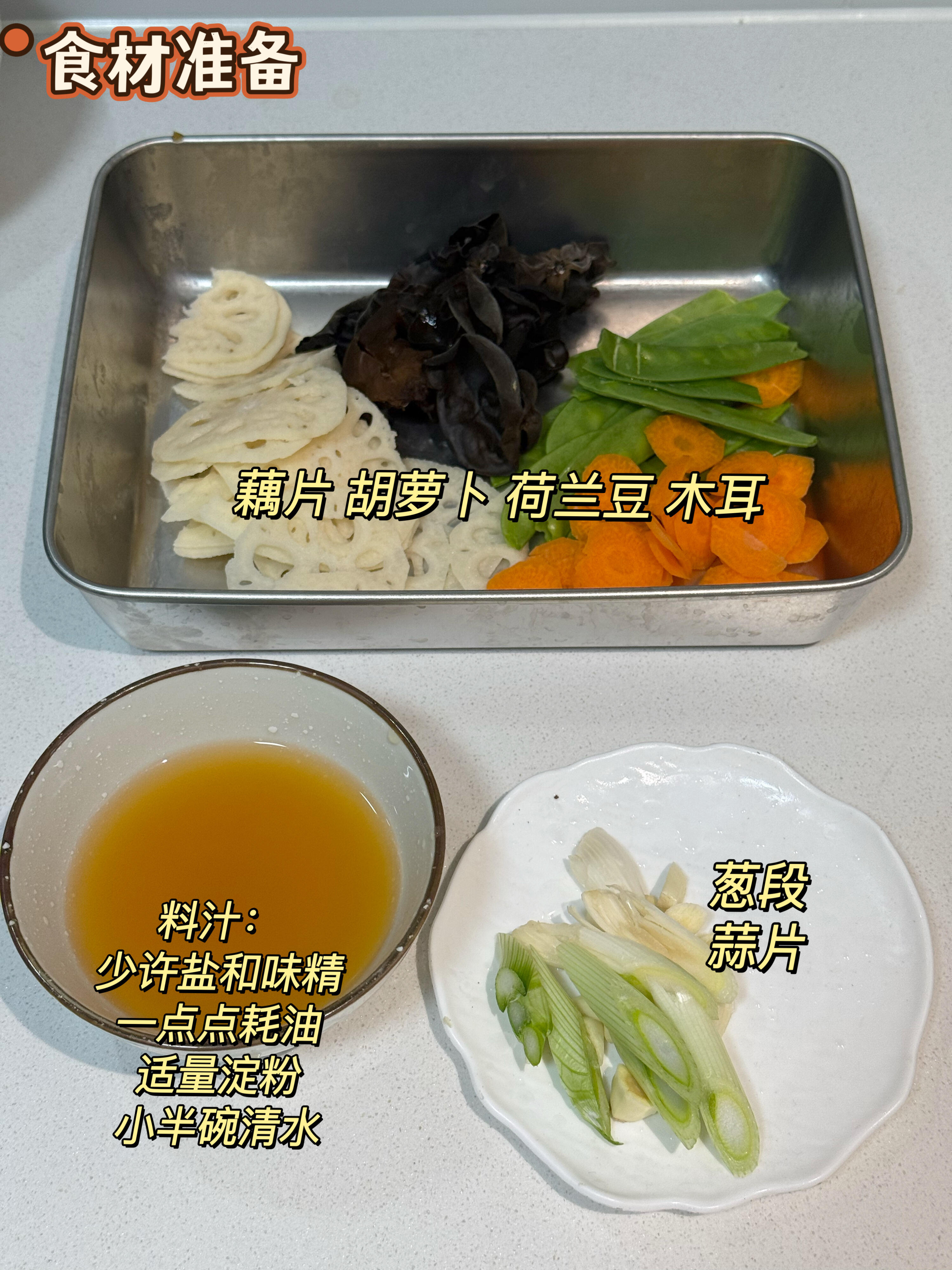 🥕食材:藕片,胡萝卜,荷兰豆,木耳,葱段,蒜片