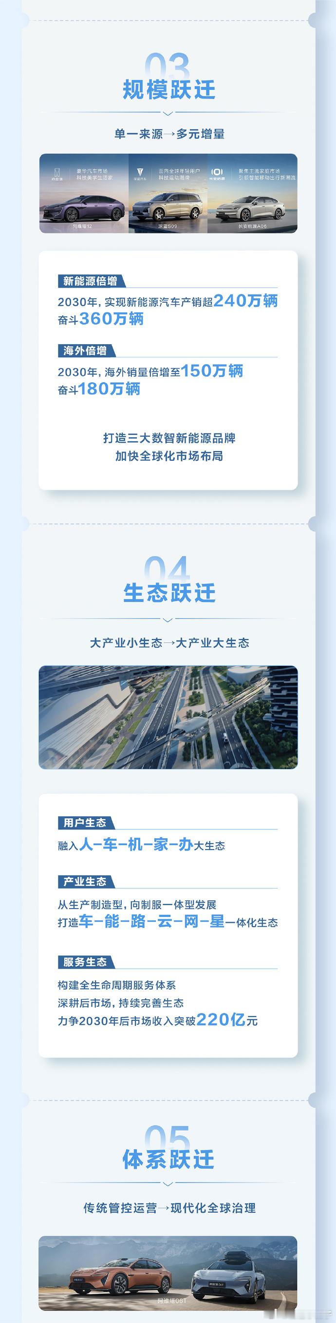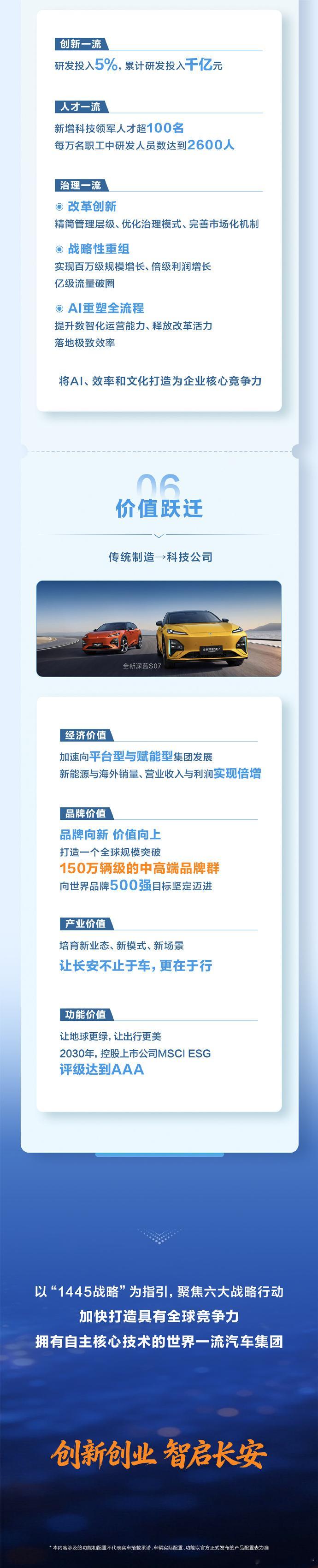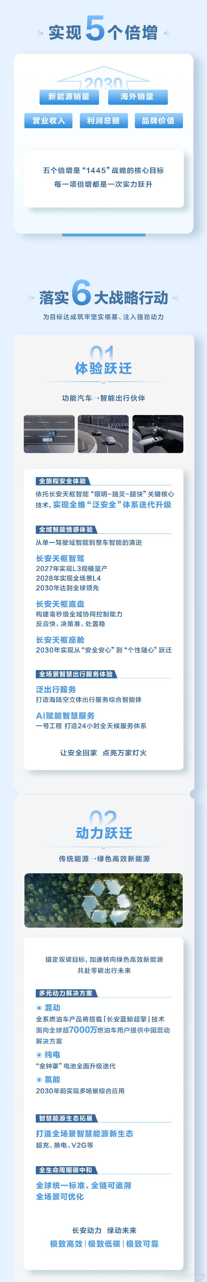 4月21日,长安汽车集团发布了“1445”战略,即:围绕一个愿景——打造具有全球竞争力,拥有自主核心技术的世界一流汽车集团;聚焦四大业务——聚力成为数智新汽车引领者、聚力成为全球领先综合方案提供者、聚力成为全价值链专业服务创新者、聚力成为未来社会生态关键节点;加速四大转型——坚定推动“北斗天枢”计划、坚定推动“香格里拉”计划、坚持创新驱动不动摇、坚定推动“海纳百川”计划;实现五个倍增,包括新能源销量、海外销量、营业收入、利润总额和品牌价值。在“1445”战略里,五个倍增被看作是核心目标。此外,还包括落实六大战略行动——即体验跃迁、动力跃迁、规模跃迁、生态跃迁、体系跃迁、价值跃迁。创新创业智启长安世界有辆长安车中国长安汽车集团全球战略发布