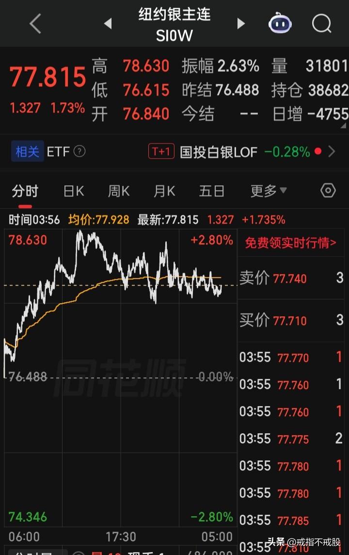 【纽约银主连】目前报77.815,涨1.73%
