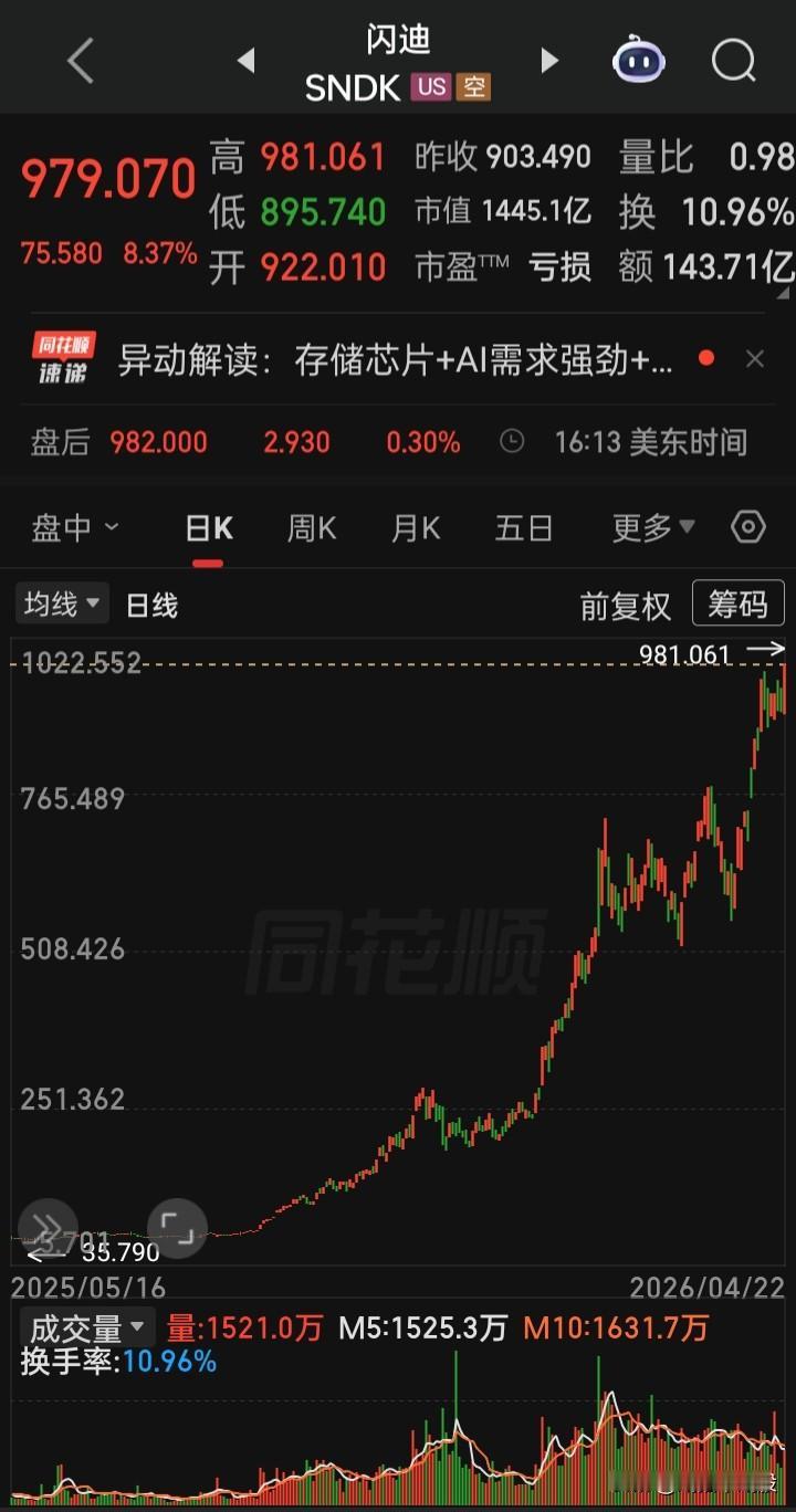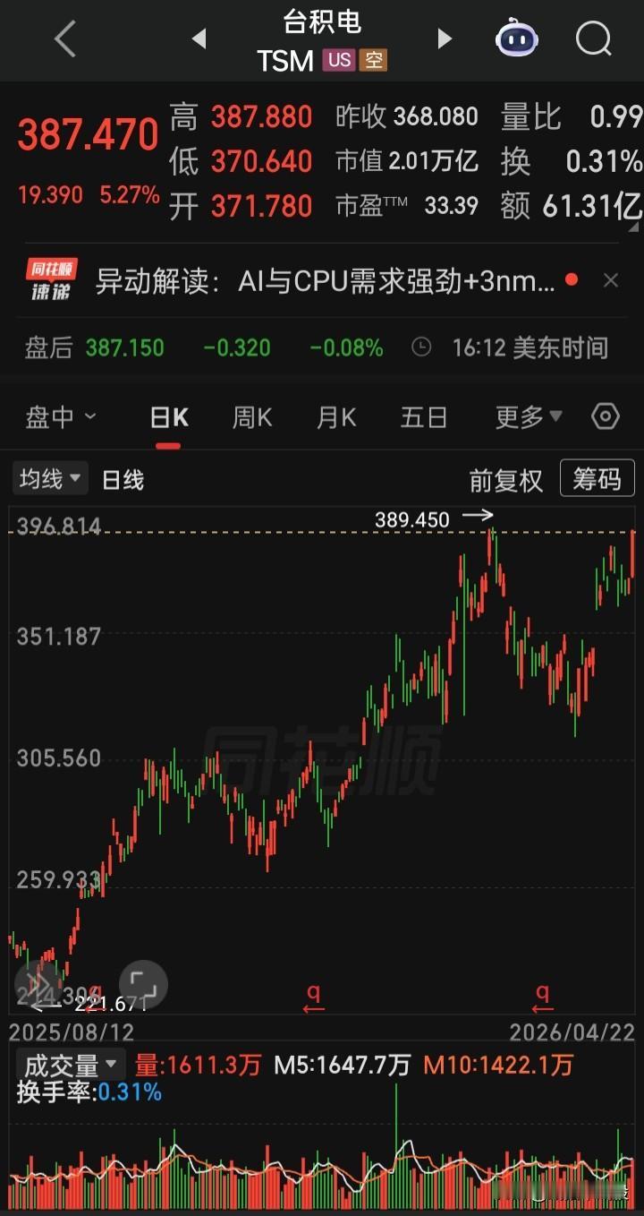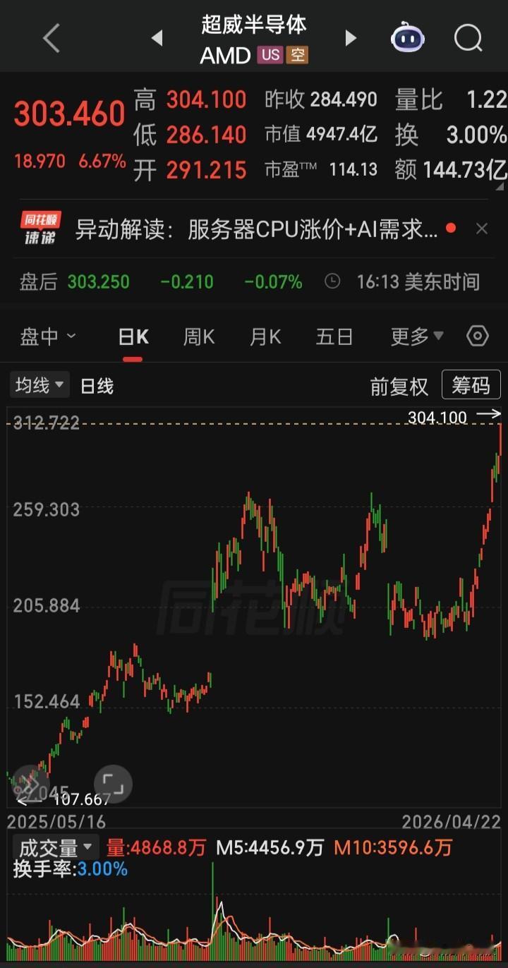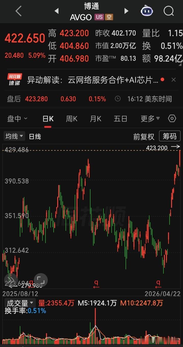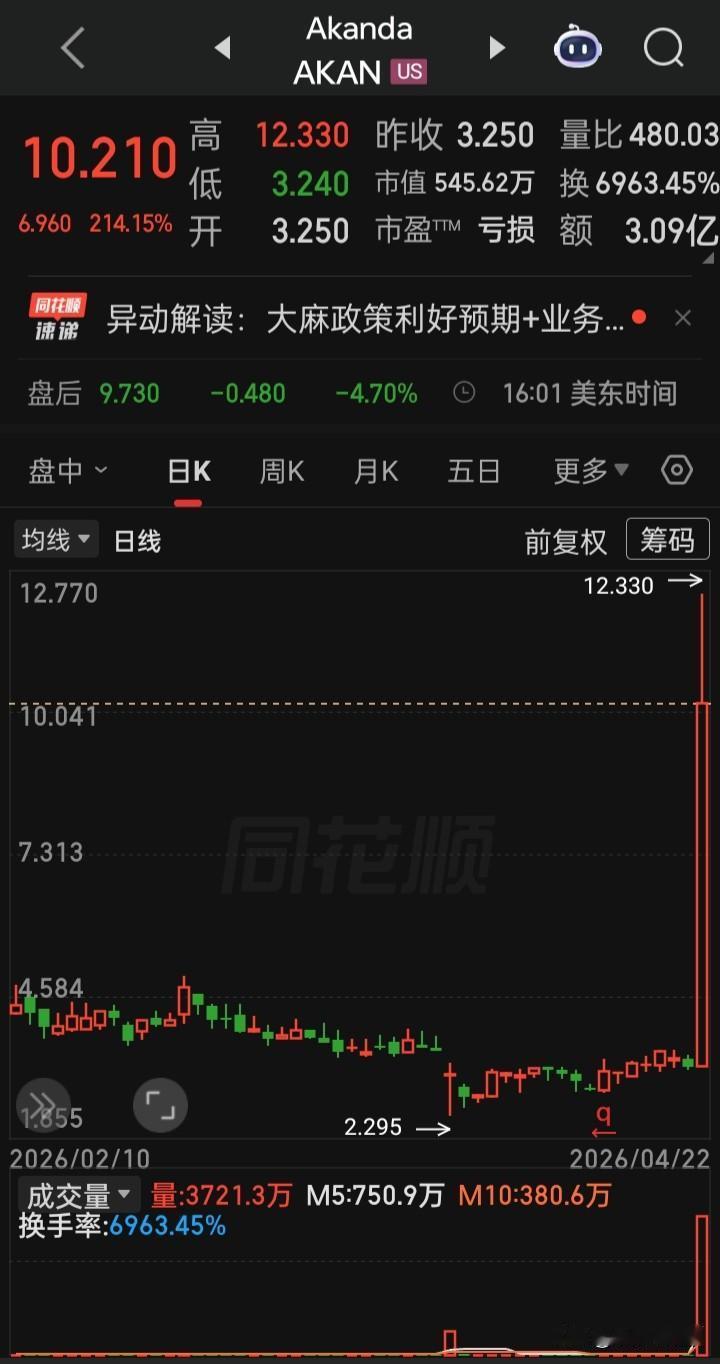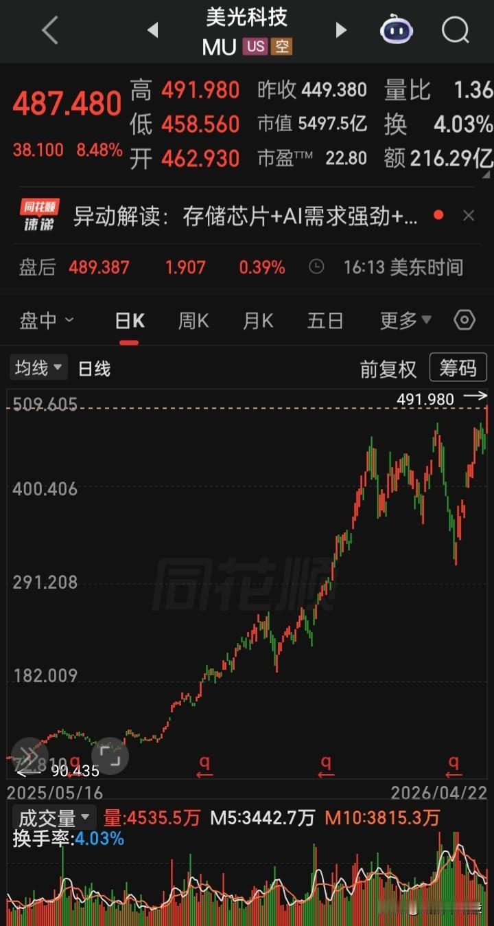 【2026.04.22】美国总统特朗普就延长对伊朗停火所设定的期限将于26日到期。美三大指高开高走,收盘齐涨,“纳指”创新高,“大麻概念股、OLED、氢能源、经销商、独立电力生产商、电气设备”等板块概念涨幅在前,“Akanda”,涨214.15%(大麻政策利好预期),“英伟达”涨1.31%,“台积电”涨5627%,“博通”涨5.09%再创新高,“甲骨文”涨3.47%,“超微半导体”涨6.67%再创新高,“美光科技”涨6.67%再创新高,“闪迪”涨8.37%再创新高,“波音”涨5.53%,“Lumentum控股(光模块巨头)”涨4.38%,“Applovin(AI广告引擎)”涨2.23%,“ServiceNow(AI平台提供商)”涨2.97%,“稳定币第一股ICircle”涨8.72%,“Swarmer(无人机技术)”跌4.07%,“纳指金龙中国”跌0.05%,“阿里巴巴”涨0.74%,“36氟”跌5.21%,“哗哩哗哩”跌2.57%,美元、离岸人民币、黄金、白银、原油涨跌幅表现