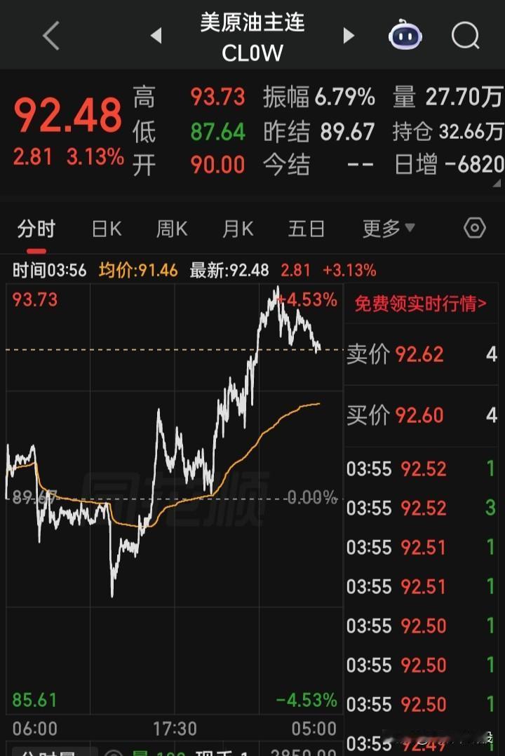 【美原油主连】目前报92.48, 涨3.13%