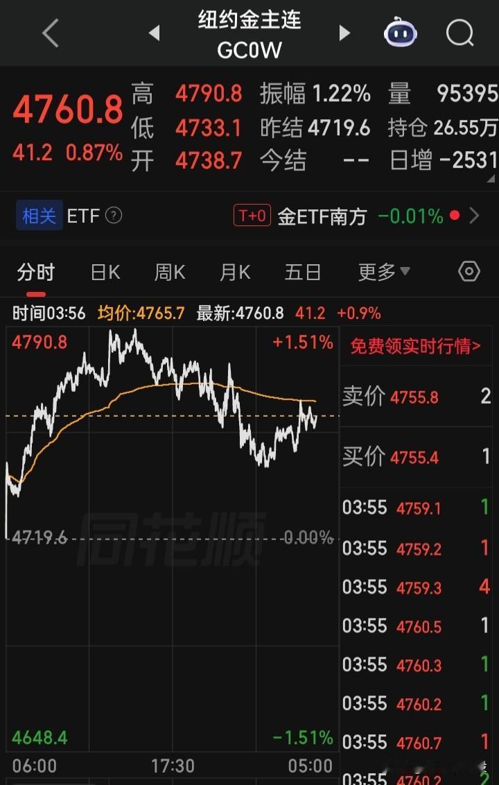 【纽约金主连】目前报4760.8,涨0.87%