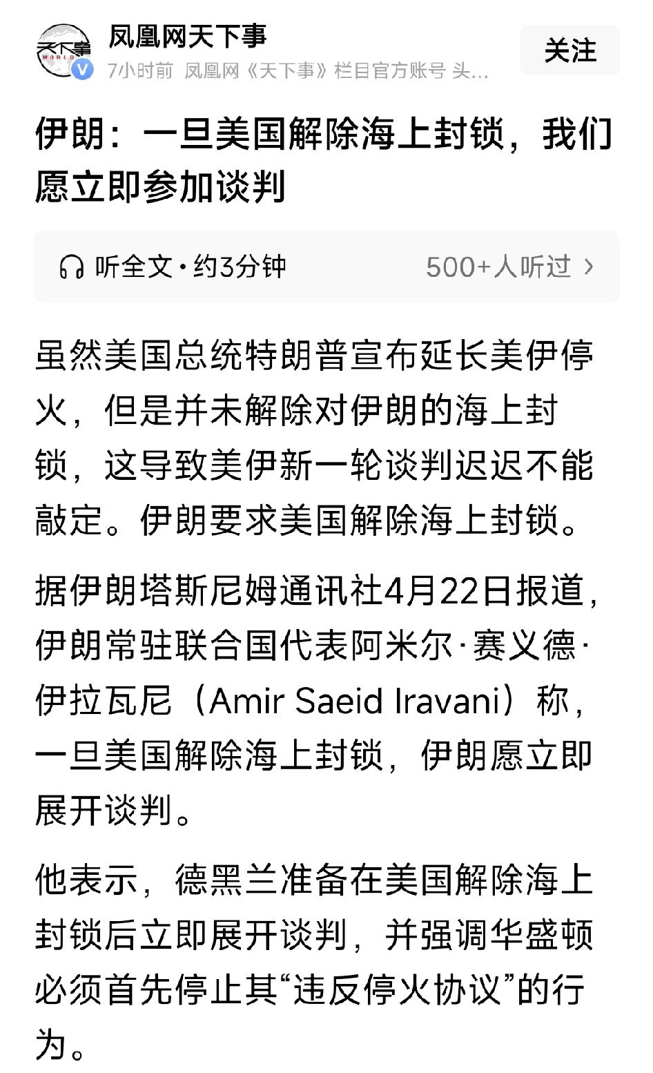 伊朗:一旦美国解除海上封锁,我们愿立即参加谈判。特朗普宣布延长美伊停火时间,但其并未解除对伊朗的海上封锁,这导致美伊新一轮谈判迟迟不能确定。现在伊朗要求美国首先解除海上封锁。伊朗常驻联合国代表阿米尔·赛义德·伊拉瓦尼称,一旦美国解除海上封锁,伊朗愿立即展开谈判。他还表示,德黑兰准备在美国解除海上封锁后立即展开谈判,并强调华盛顿必须首先停止其“违反停火协议”的行为。