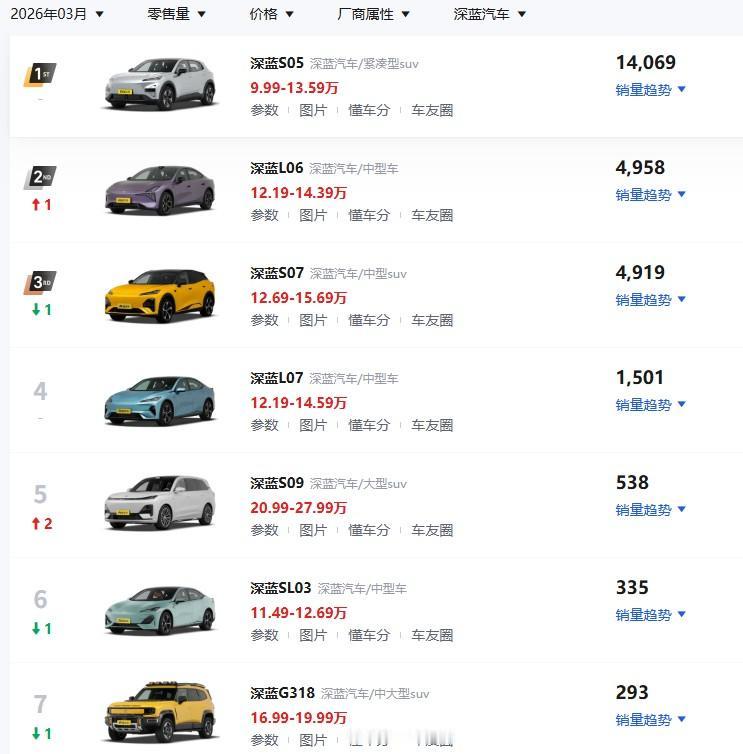 深蓝汽车2026年3月分车型销量: 深蓝S05,14069辆;L06,4958