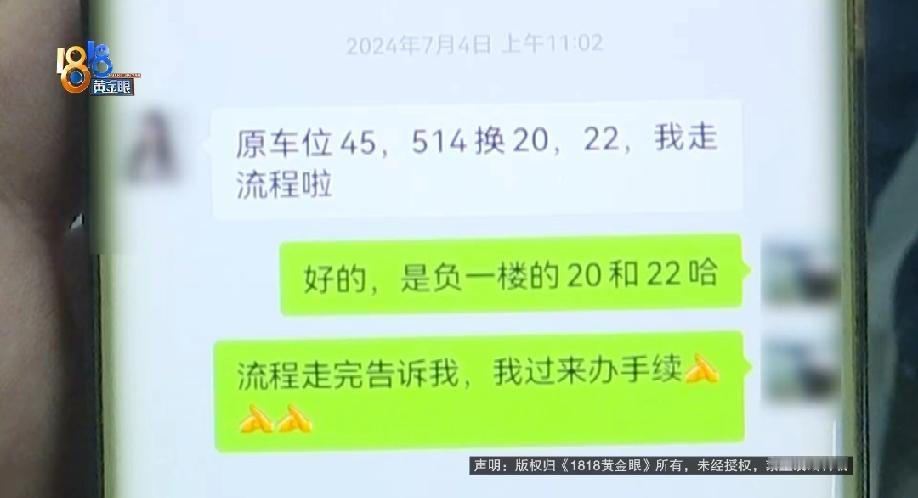 销售表示,要把原来的45号、514号车位,换成负一层的20号和22号车位,几乎是相连的两个车位。