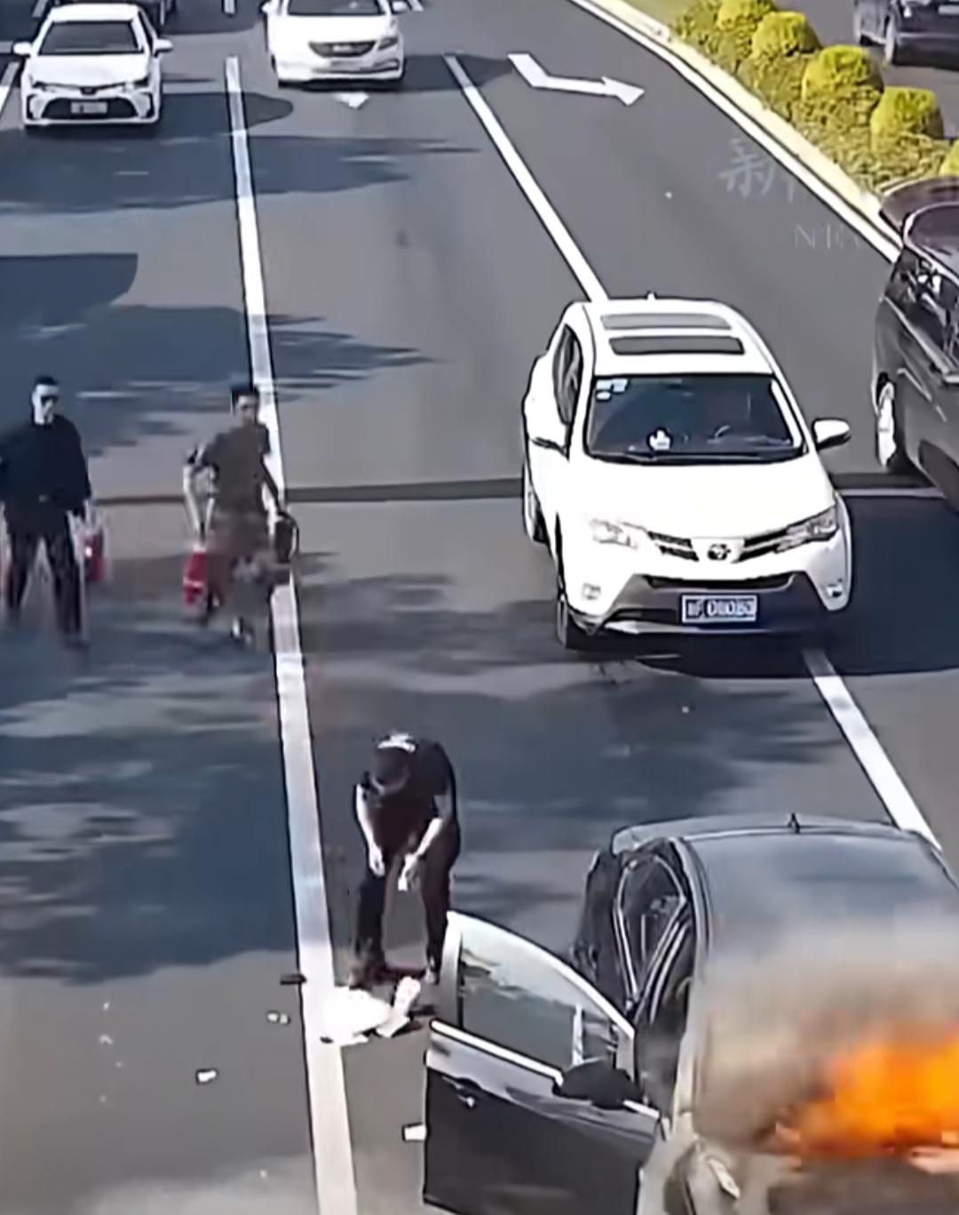 就在这时,暖心的一幕发生了。路过的司机们没有犹豫,纷纷靠边停车,拎着车上的灭火器冲了过来。白色轿车、黑色SUV、出租车……原本在车流里的人们,此刻都朝着同一个方向奔跑。他们围着自燃的车辆,对准火源猛喷干粉,有人帮忙疏导交通,有人帮司机撤离到安全地带,短短几分钟,一场可能失控的火情,就在众人的合力下被压制住了。