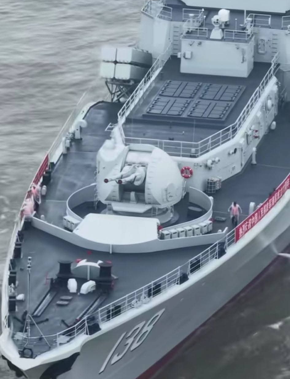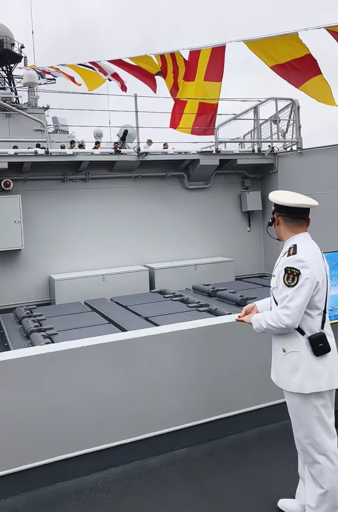 人民海军成立77周年在DY上刷到更多泰州舰回家的图片和视频,转发几张(侵删),可以看到舰艉的16单元垂发,舰艏的32单元垂发,还有红旗10和鹰击12。