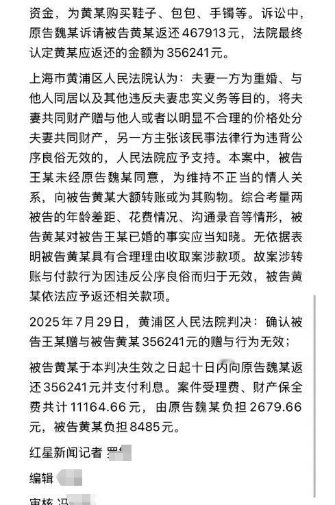 法院经审理查明,黄某明知王某已婚,仍与其保持不正当关系,王某私自处分夫妻共同财产的行为,违背公序良俗,当属无效 。最终判决:黄某须返还356241元,并支付资金占用利息,案件受理费也由黄某承担。