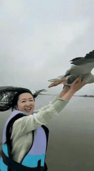 大雁在她手上停留了一会儿,脑袋轻轻转了转,看了看女子,又看了看周围的湖面,神态特别放松,完全没有一点害怕的样子。