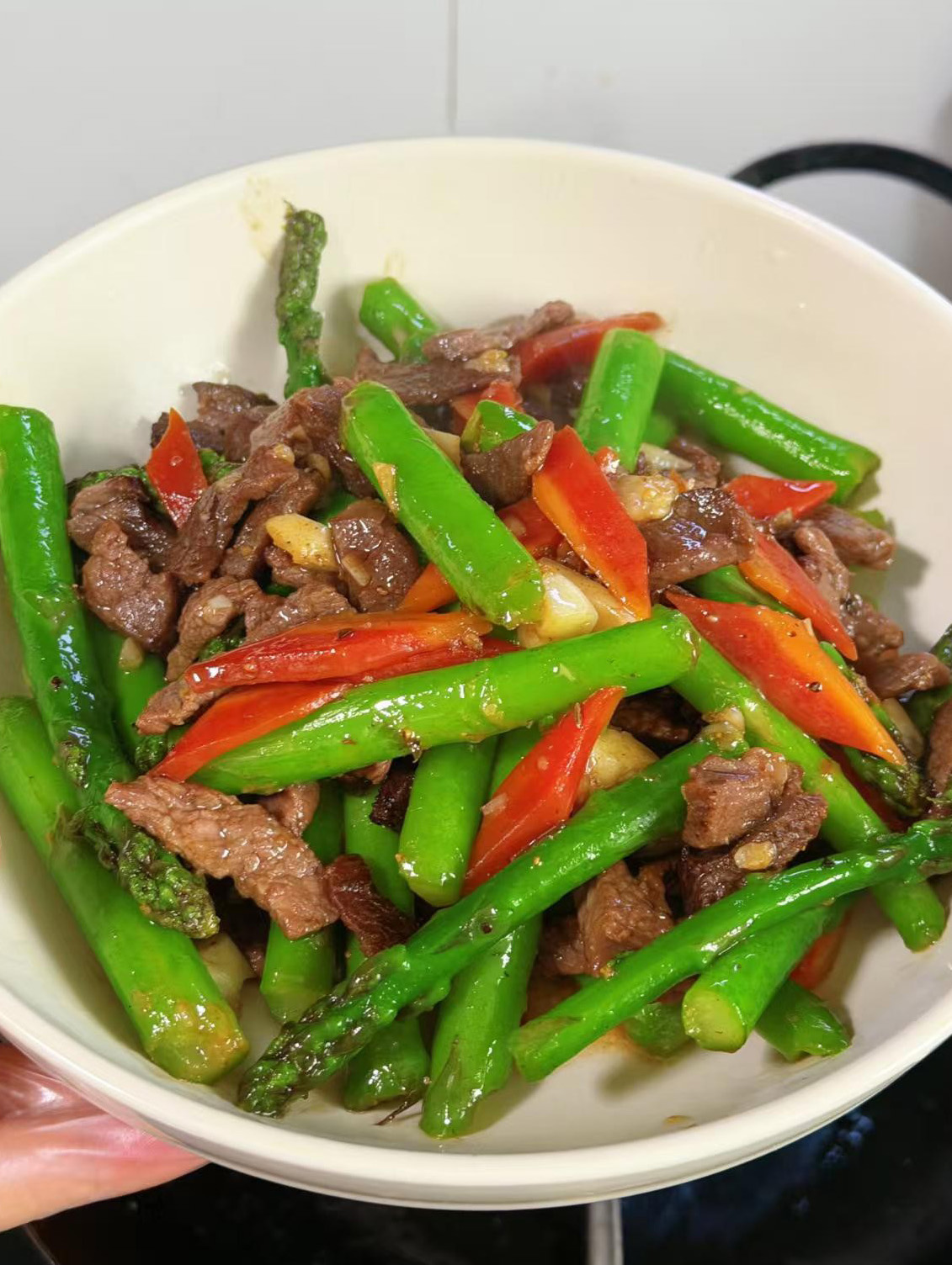 👉 做法:牛肉切薄片,用生抽、淀粉抓匀腌10分钟;芦笋切段焯水1分钟;热油滑熟牛肉盛出;炒香蒜末,下芦笋翻炒,倒回牛肉,加一勺蚝油、少许黑胡椒,快速炒匀出锅。