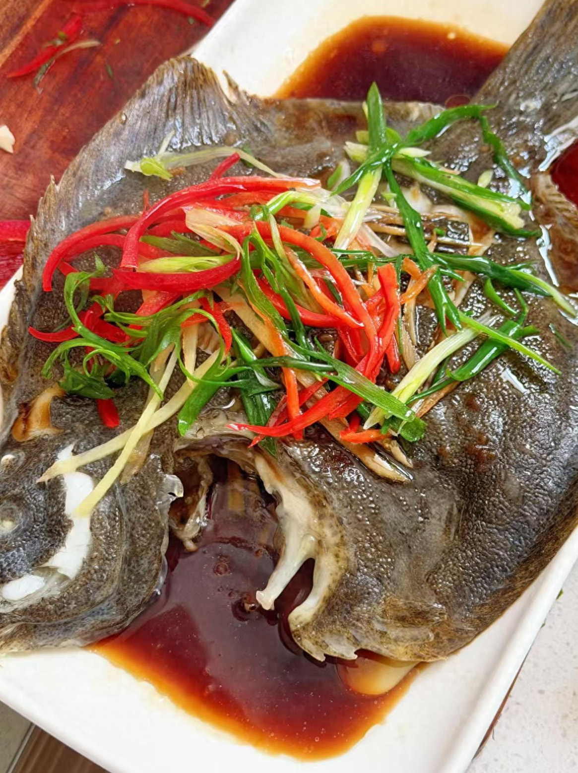 👉 做法:多宝鱼处理干净,两面划几刀,抹少许盐和料酒,铺姜片葱段;水开后上锅蒸8-10分钟,倒掉盘里汤汁;淋蒸鱼豉油,撒葱花,浇一勺热油。