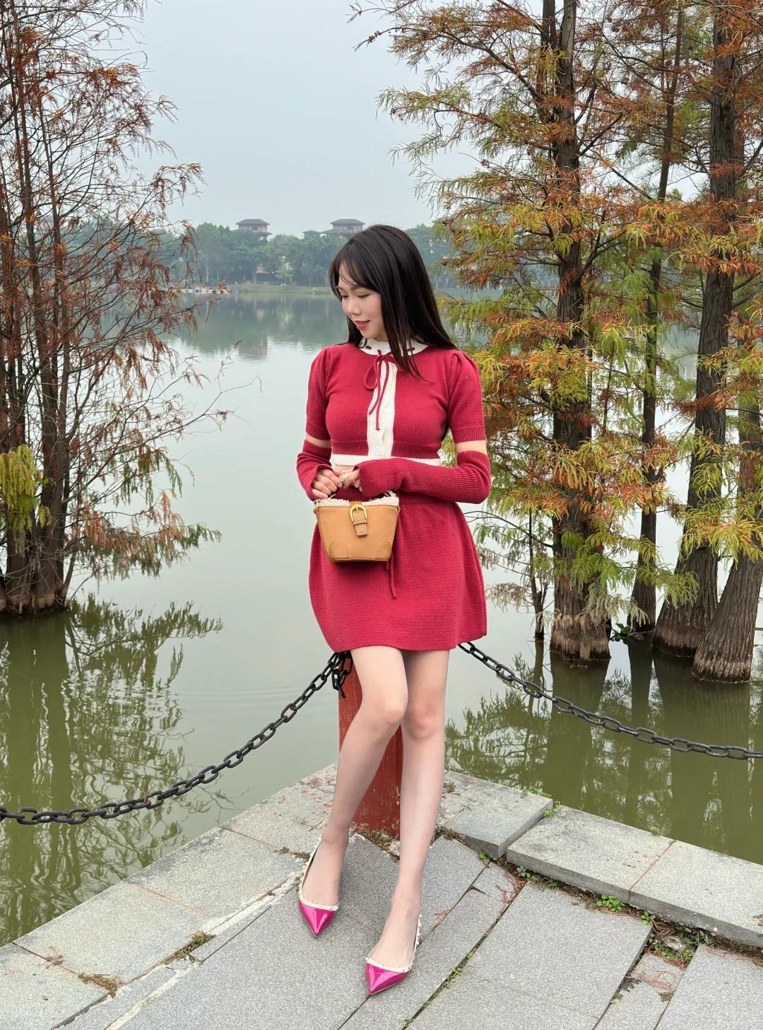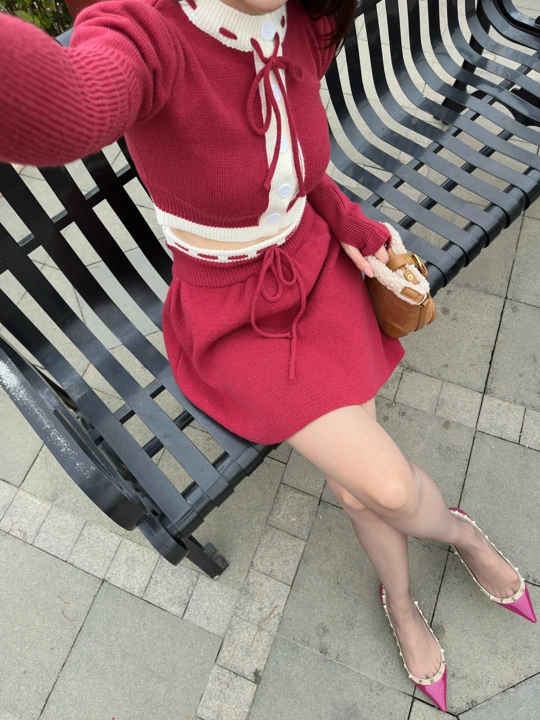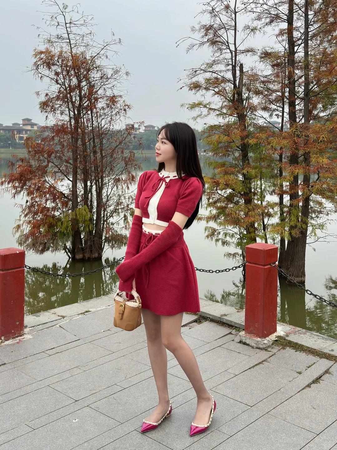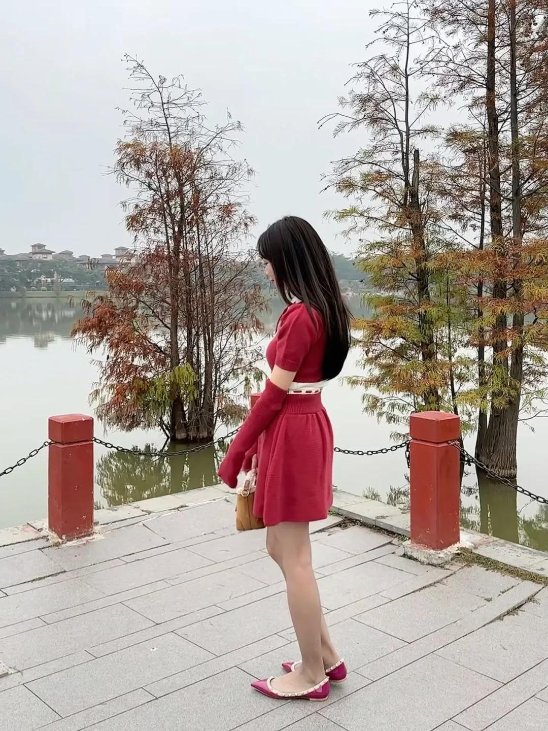 今天是甜到心巴上的草莓蛋糕本人!这套红白针织套装软乎乎的,短款上衣 + A 字短裙,还带了配套袖套,红白撞色自带甜妹 buff,露腰设计又带点小小心机。在湖边公园拍超有秋日氛围,约会、逛公园穿都合适,舒服又出片~