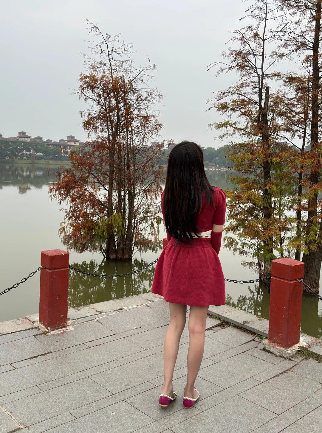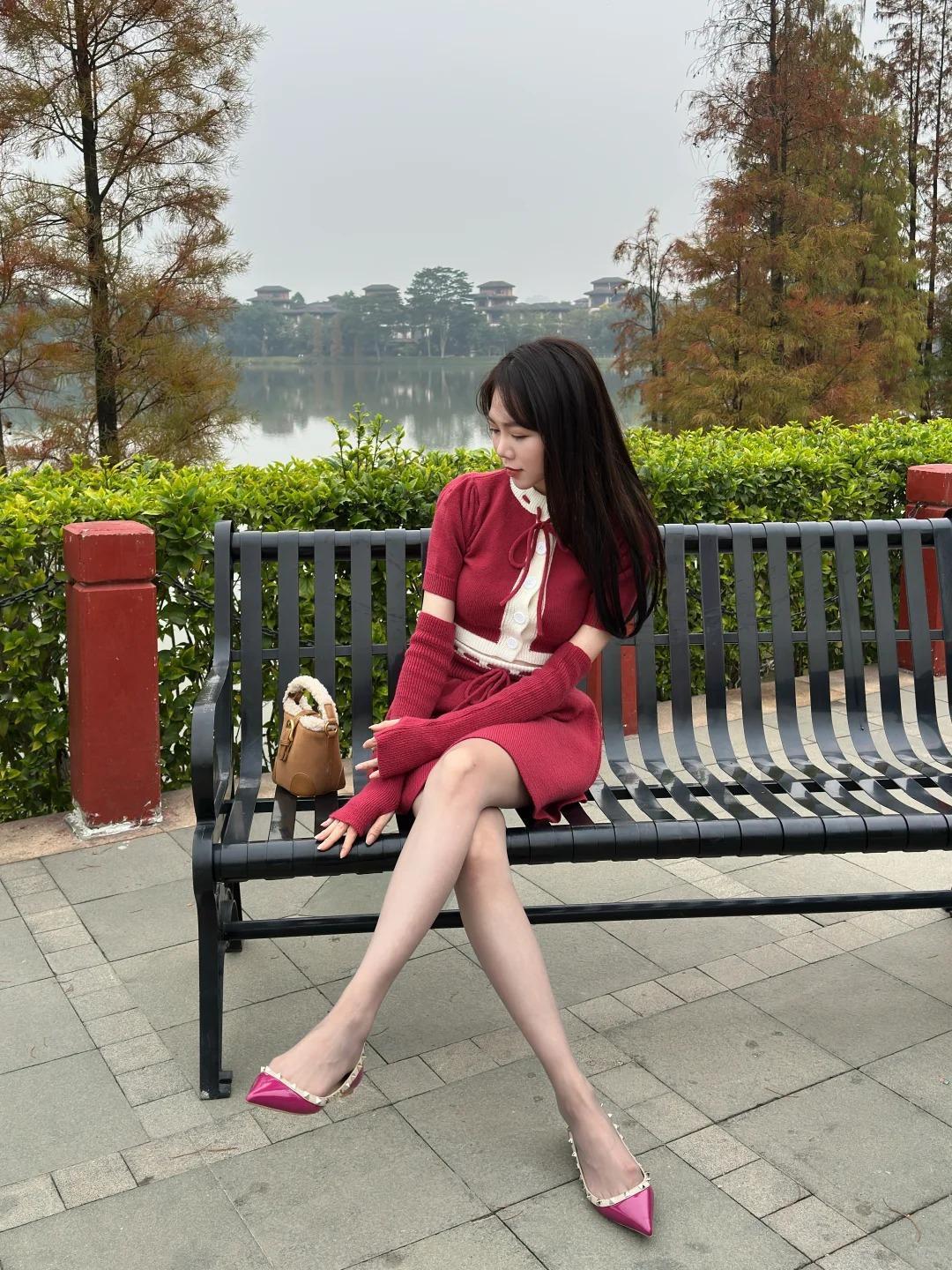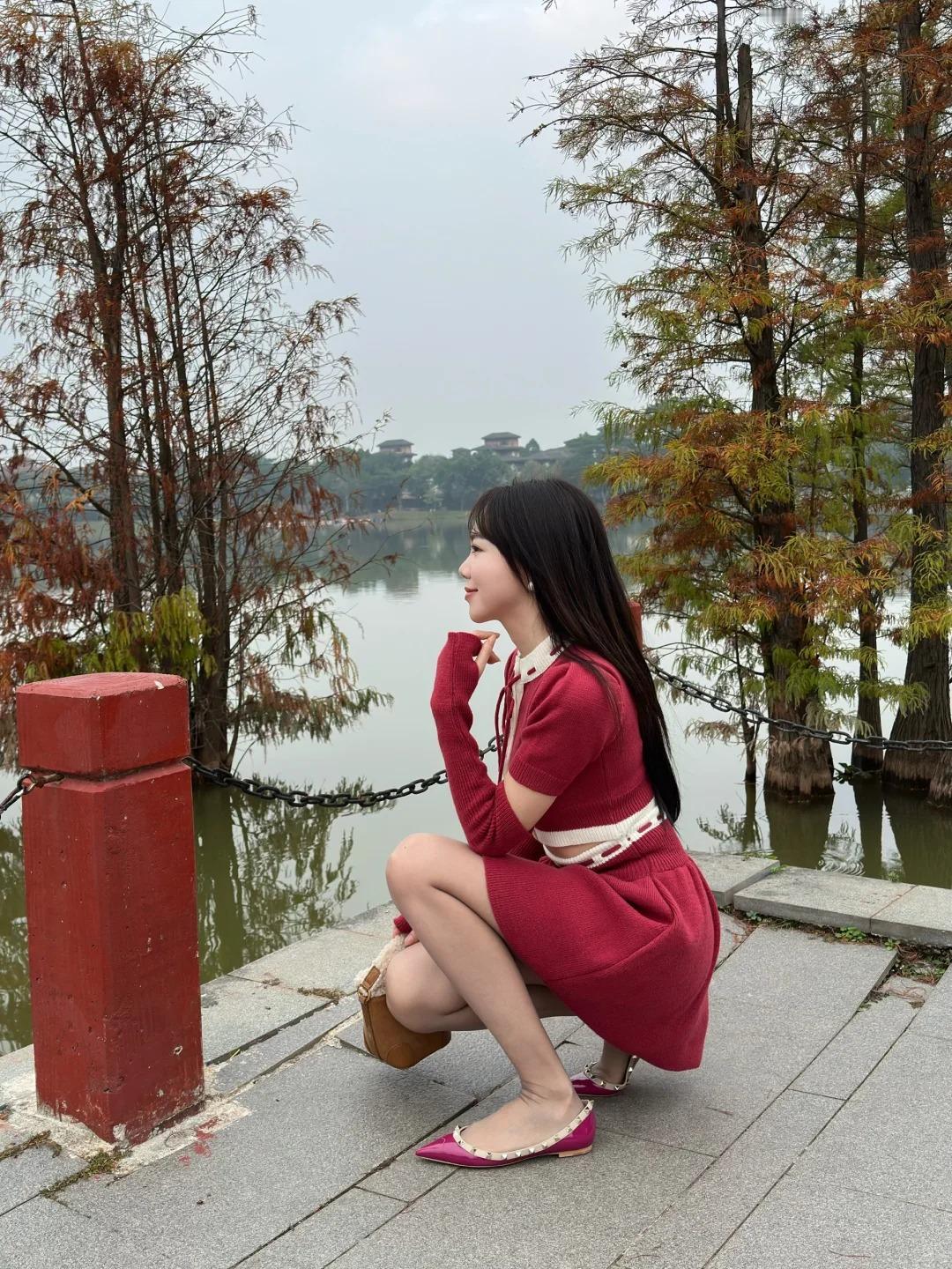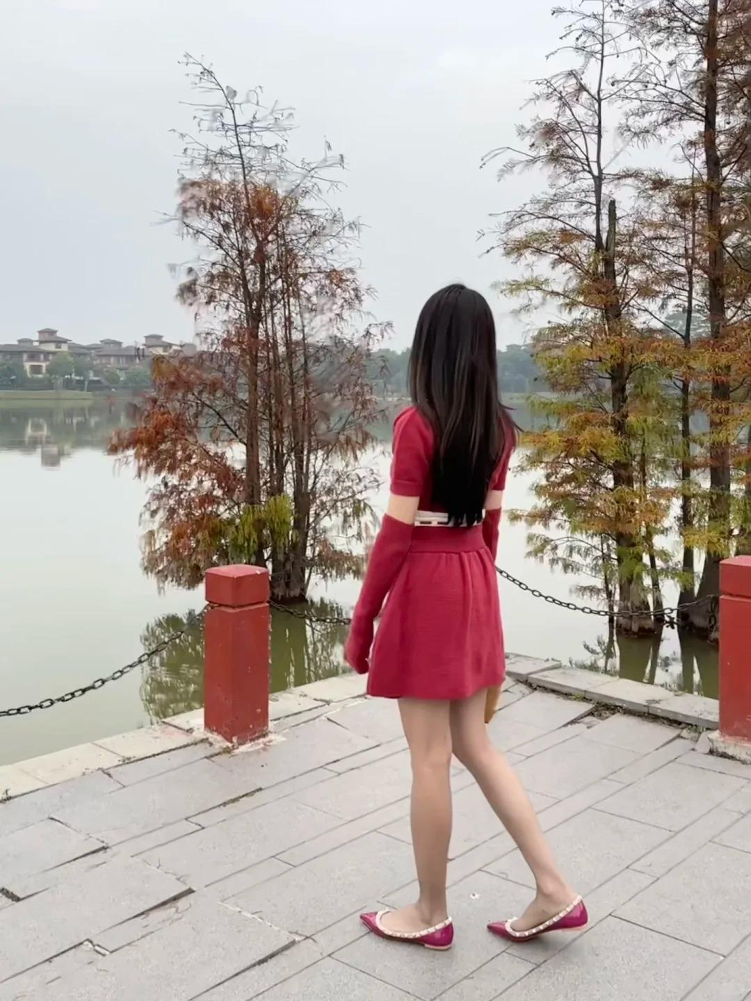 今天是甜到心巴上的草莓蛋糕本人!这套红白针织套装软乎乎的,短款上衣 + A 字短裙,还带了配套袖套,红白撞色自带甜妹 buff,露腰设计又带点小小心机。在湖边公园拍超有秋日氛围,约会、逛公园穿都合适,舒服又出片~