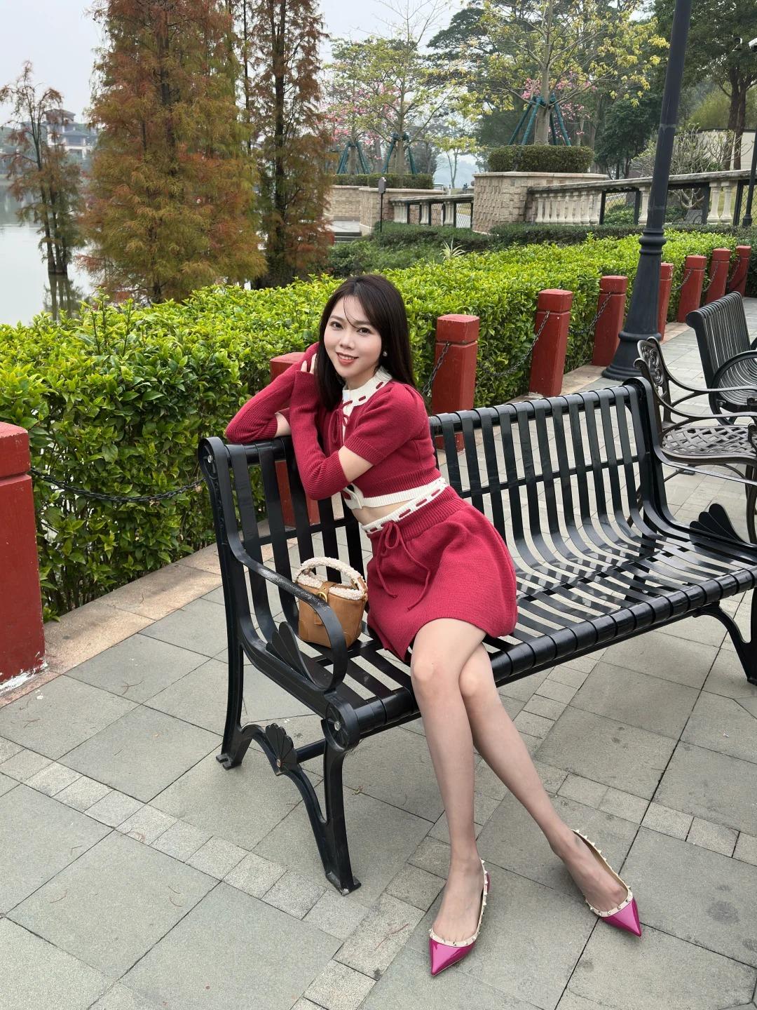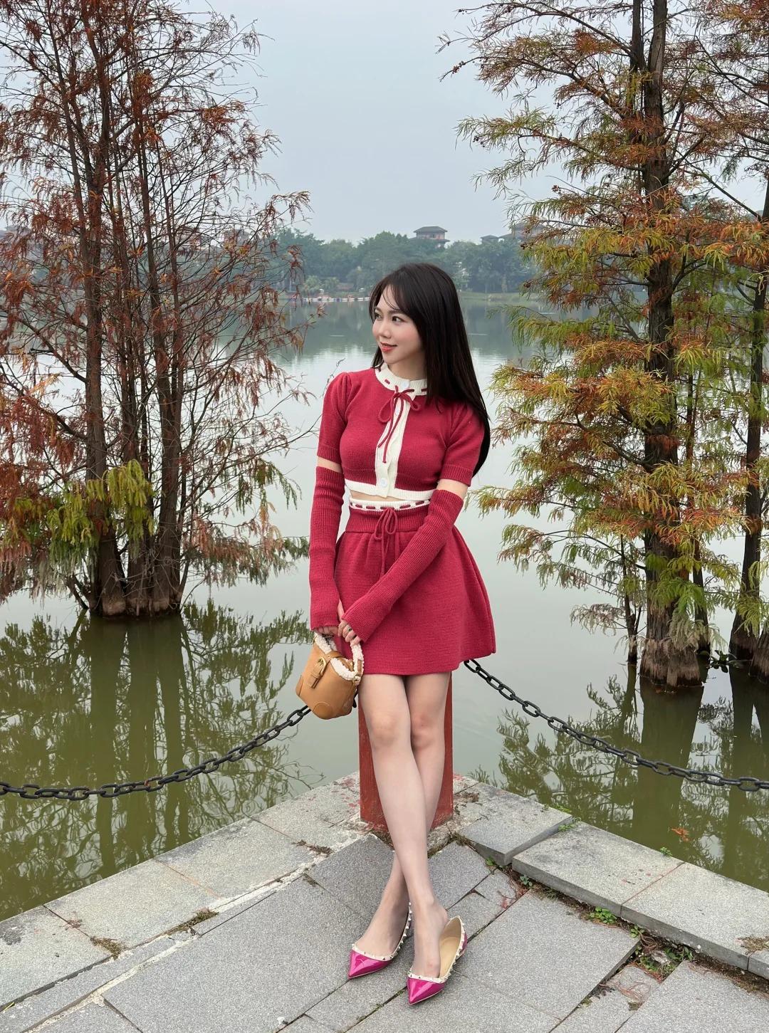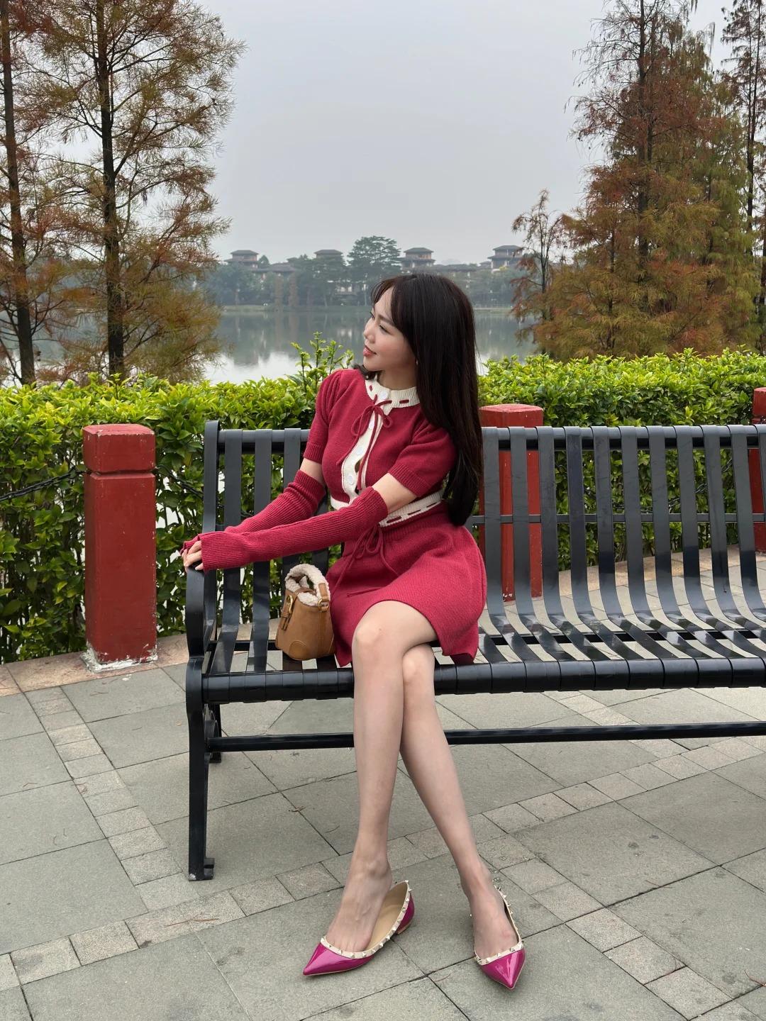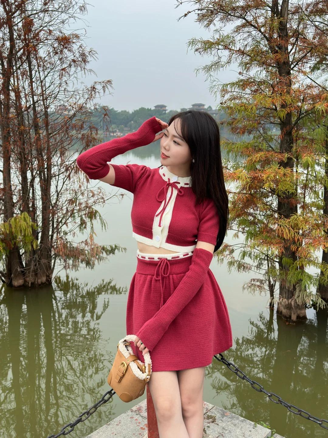 今天是甜到心巴上的草莓蛋糕本人!这套红白针织套装软乎乎的,短款上衣 + A 字短裙,还带了配套袖套,红白撞色自带甜妹 buff,露腰设计又带点小小心机。在湖边公园拍超有秋日氛围,约会、逛公园穿都合适,舒服又出片~