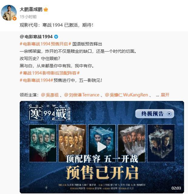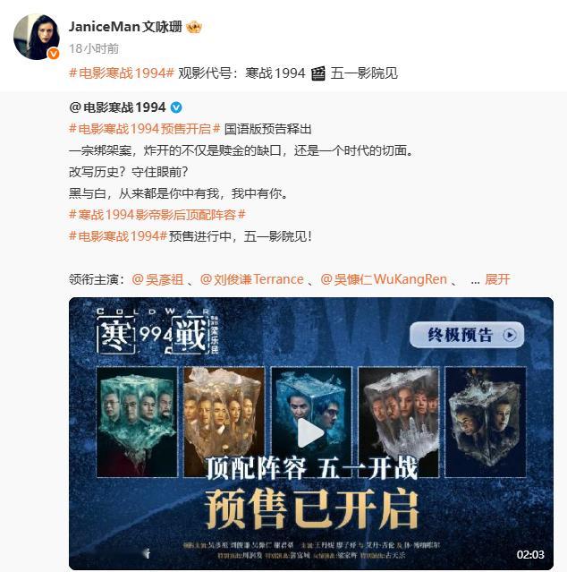 众星给寒战1994打call半个内娱在给寒战1994打call 黄晓明、王珞丹、李现、李一桐、井柏然、白宇、周笔畅、欧豪等内娱艺人纷纷转发为《寒战1994》打call,一出手就摇来了半个内娱,《寒战1994》阵容顶排面也顶!