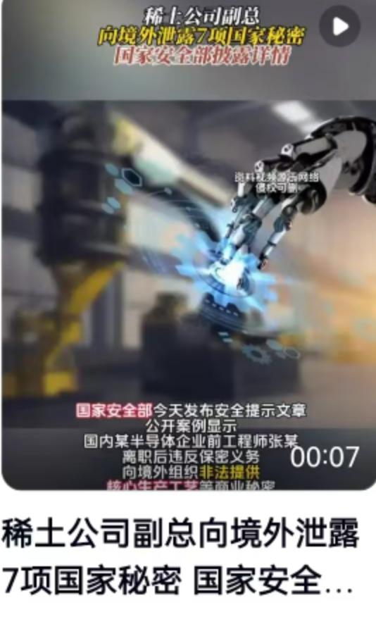 国家安全部近期通报的一起稀土领域泄密案,精准戳中了很多人的痛点。一家稀土公司的副总经理,在境外人员开出的金钱筹码面前败下阵来,把我国稀土收储的品类、数量、价格等7项机密级国家秘密打包交了出去。这起案件里没有硝烟,却真真切切地关乎国家资源安全的命门。